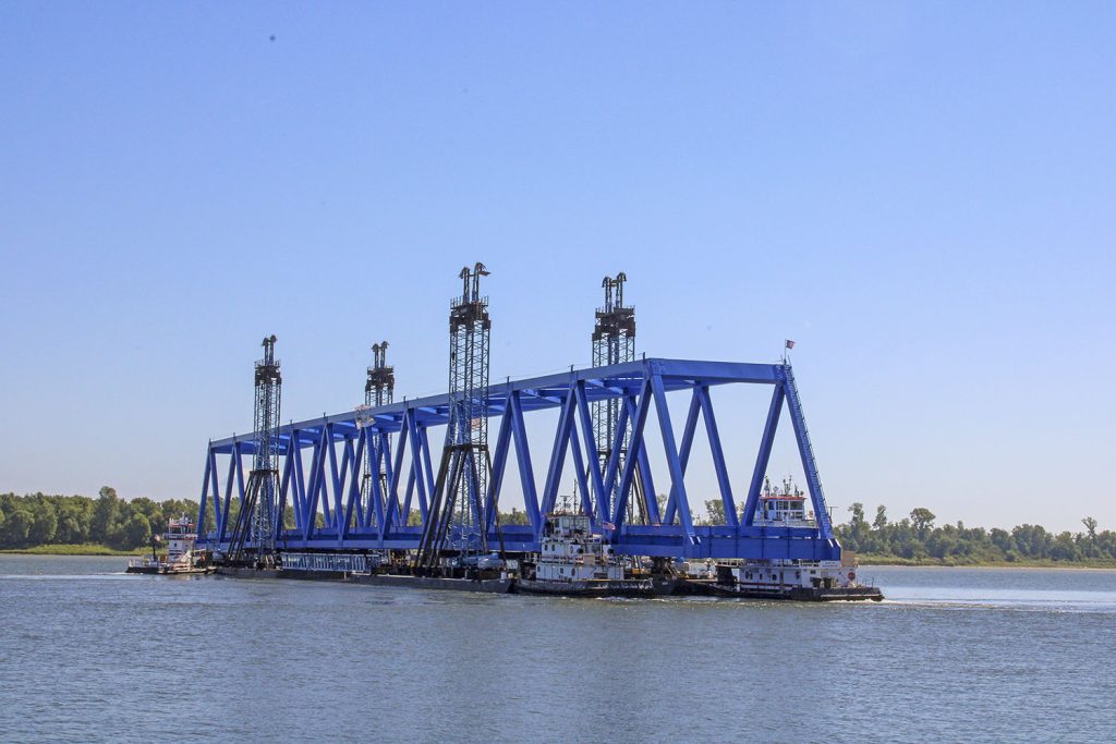 American Bridge Company, the subcontractor for the steel bridge superstructure, has been at work on the project since July 2021 at the Paducah-McCracken County Riverport Authority, although the first structural steel was put in place last September. The truss was built atop four jumbo barges and three 120-foot barges provided by Paducah Barge and McDonough Marine Service. James Marine reinforced the jumbo barges to handle the 6.7-million-pound load, which included both the truss and temporary supporting steel.