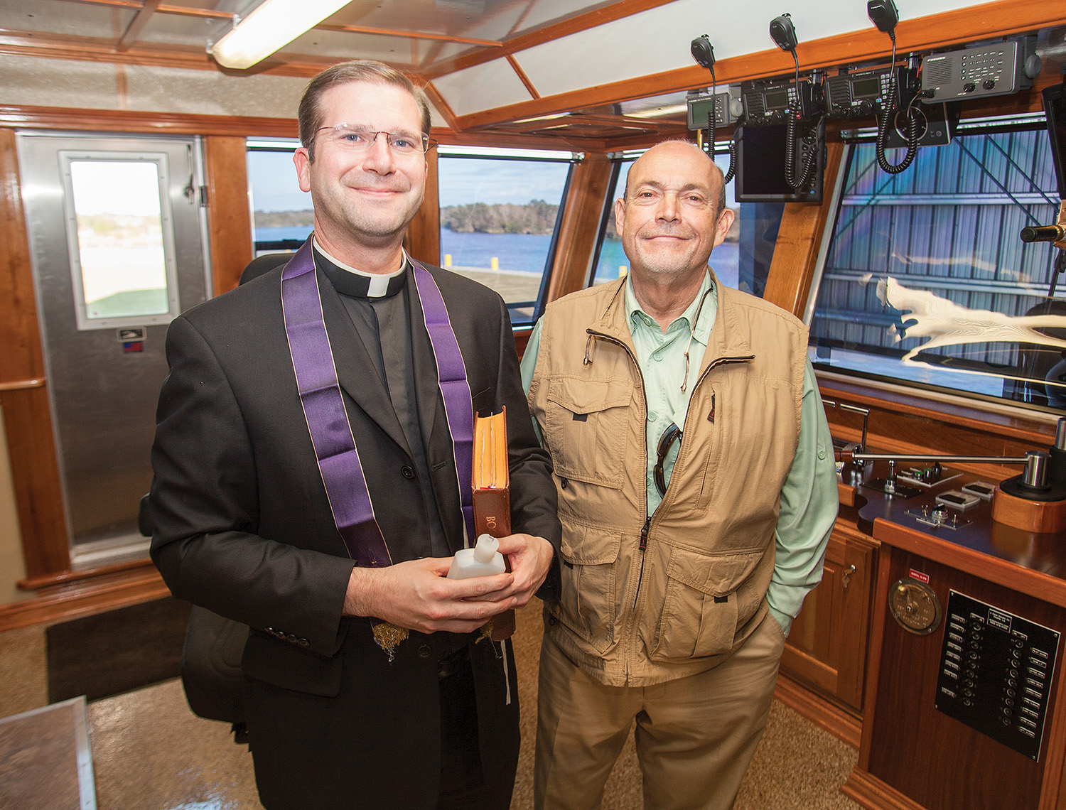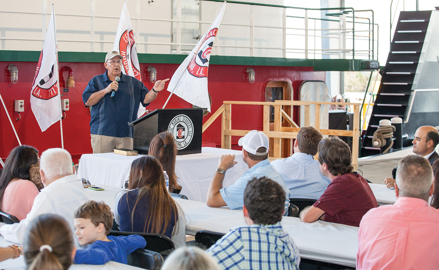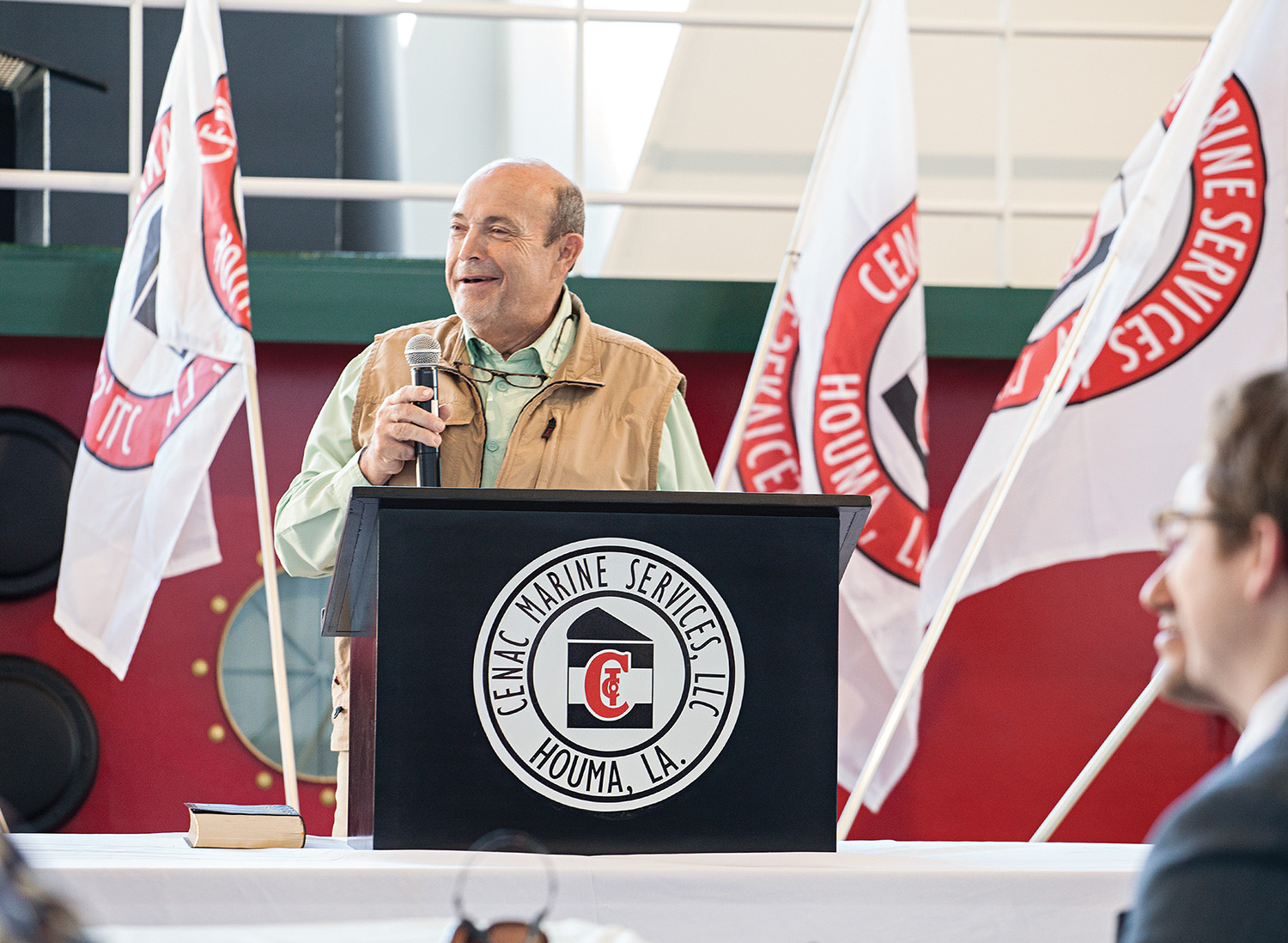 The christening ceremony for the mv. Jean Pierre Cenac was highlighted by a spoken history of the Cenac family by Christopher Cenac, local medical doctor, Benny Cenac’s cousin and family historian. Christopher Cenac has published two history books, one on the Cenac family titled Eye of an Eagle: Jean-Pierre Cenac, Patriarch and a second titled Livestock Brands and Marks: An Unexpected Bayou Country History.
