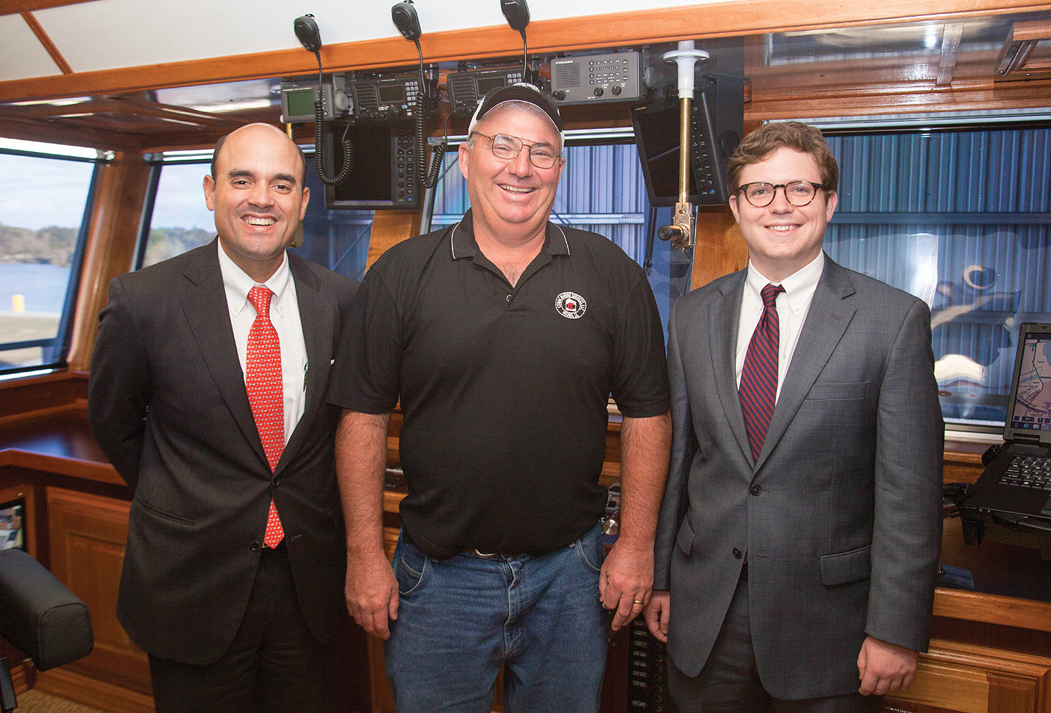 Cenac Towing Chief Executive Officer Benny Cenac is Jean Pierre Cenac’s great great grandson. Benny Cenac’s grandfather, Jock, founded Cenac Towing in the 1930s, and his father, Arlen Sr., former head of the company, along with his two grandchildren, shattered a bottle of champagne over the bulwark of the mv. Jean Pierre Cenac to conclude the ceremony.