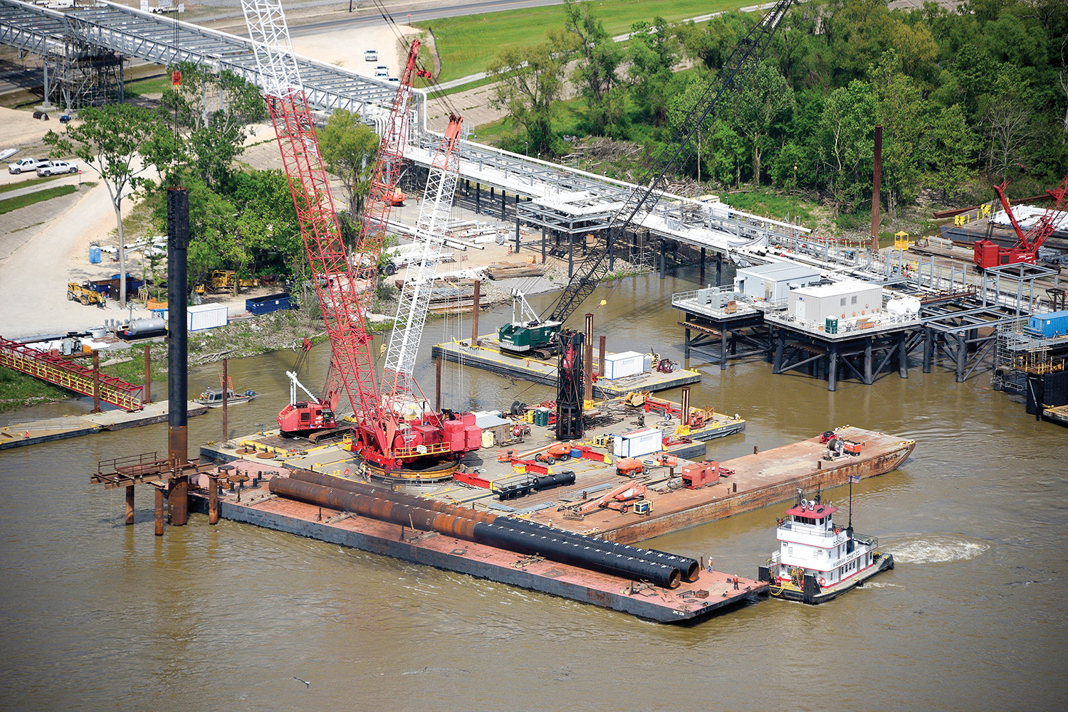 Casey Hedge, marketing specialist at Massman, said the five structures were an electrical platform, firewater platform, dock house, dock and a hose tower. “We also constructed an elevated pipe rack that spans from the dock facility to the batture and across the levee and River Road, where it ties into the landside construction work,” said Hedge.