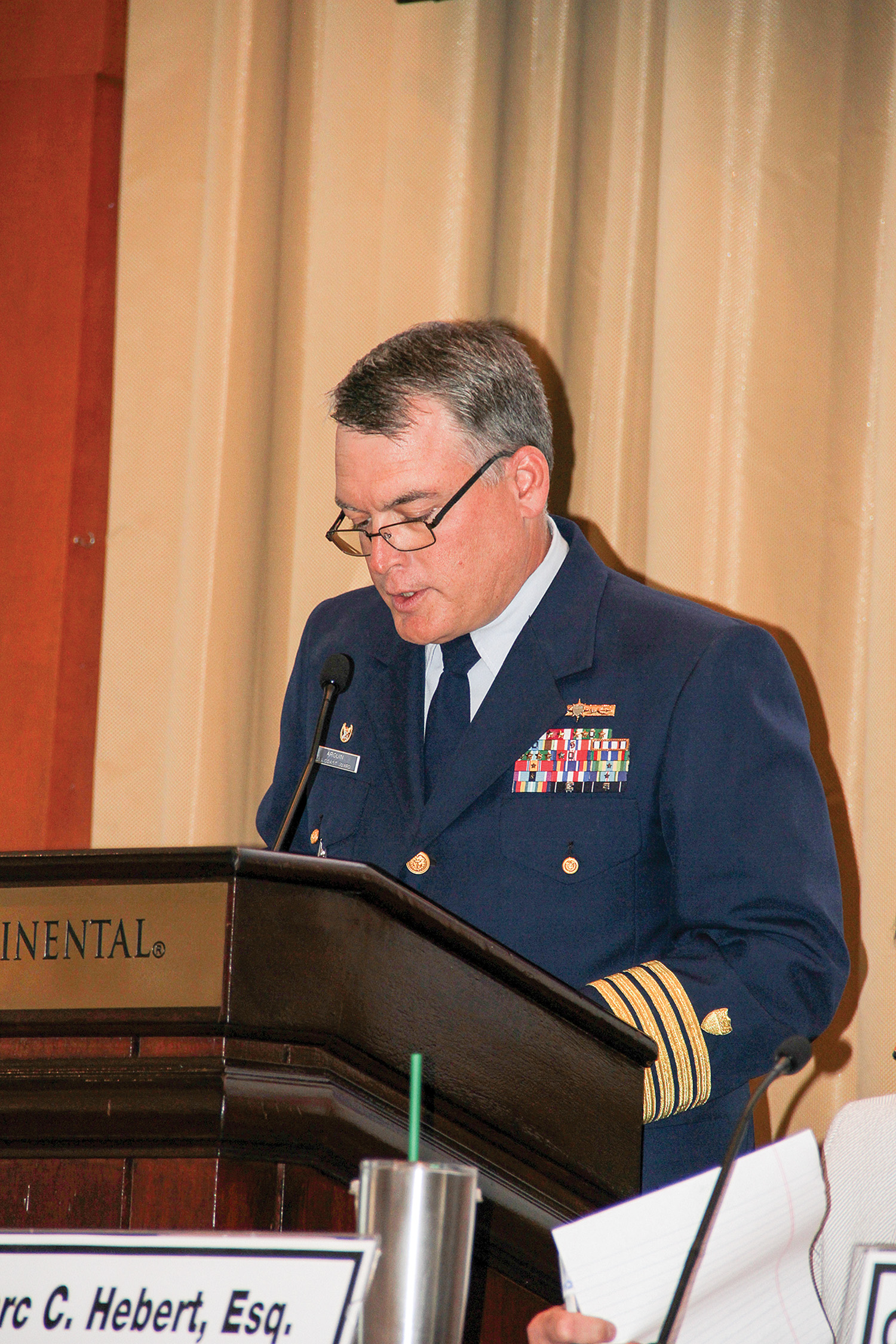The opening talk was given by Rear Adm. Paul Thomas, commander of the Eighth Coast Guard District, headquartered in New Orleans. Thomas noted that this was his first appearance before GNOBFA and thanked “all those here today who helped me learn about brown water.”