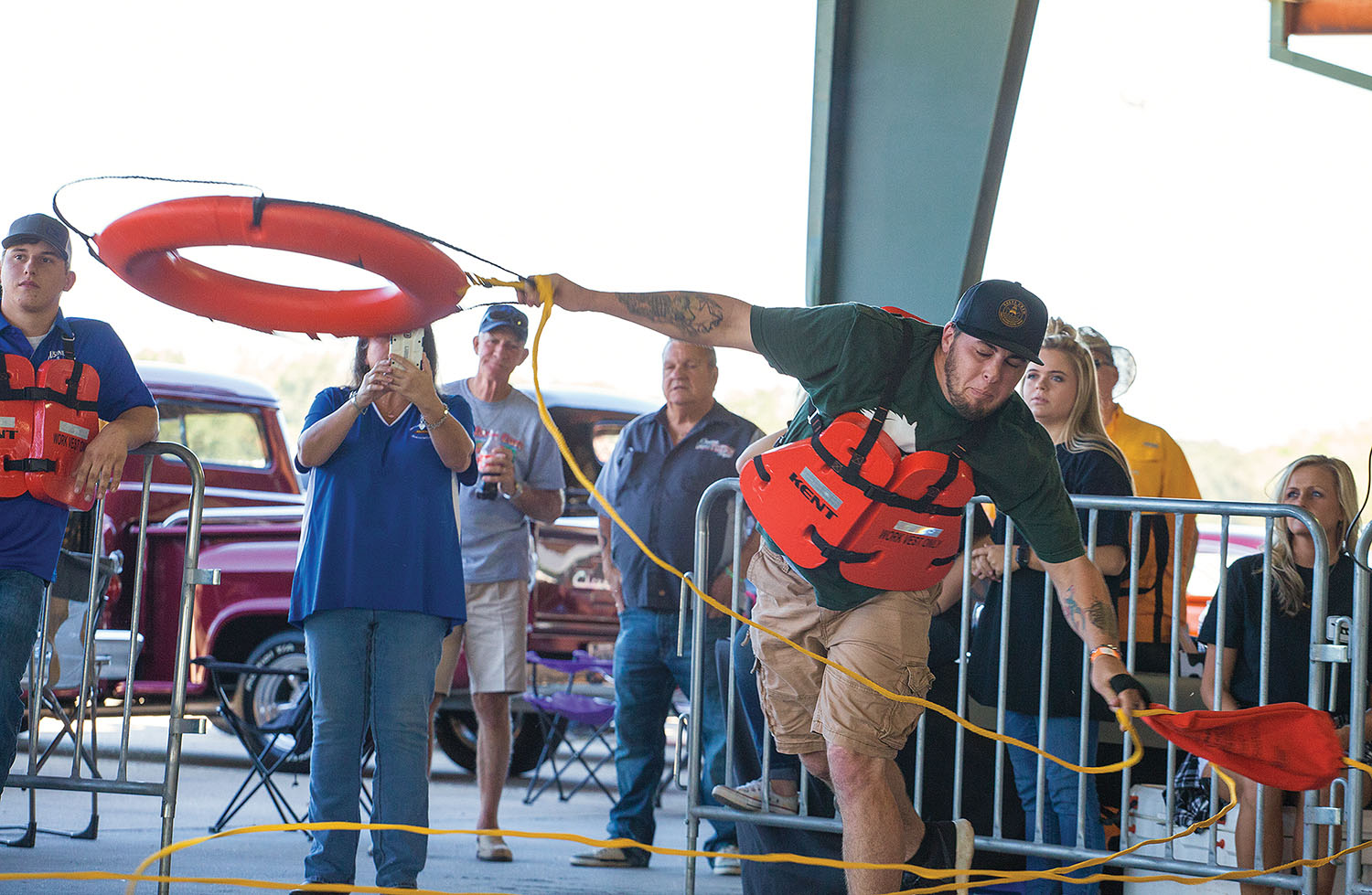 After a short break between the distance throwing competitions, mariners faced off on the Maritime Throwdown course, made up of six mooring stations that simulated securing lines via a D-ring, vertical kevel, single timber, horizontal kevel, ship hook and extended piling.
