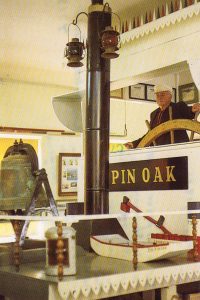 The Pin Oak turned over and sank in Sandy Hook Bend on July 29, 1896, near Wyss Landing. A large replica of the riverboat’s pilothouse is exhibited in the River Room of the former German School building (312 Schiller St.), which houses the town museum at Hermann. Also displayed are boat models, photographs, boat-building tools and other riverboat relics.