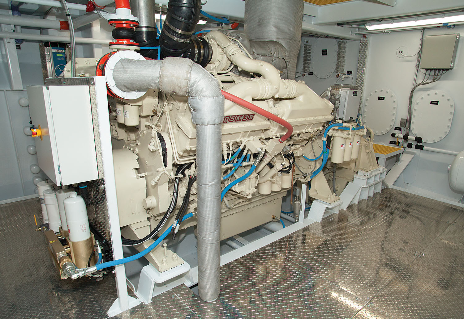 Intracoastal Iron Works of Bourg, La., designed and built the Syble Fay, a 2,000 hp. towboat measuring 78 feet by 34 feet with open wheels and a depth of 10 feet. Cummins Mid-South supplied the vessel’s two Cummins QSK38 main engines. The main engines are coupled to Reintjes WAF 563 marine gears with a 5.947:1 ratio from Karl Senner. Houma Machine & Marine LLC supplied the Syble Fay’s four-blade Sound propellers, which measure 78 by 66 inches. The vessel has 7-inch shafts and features Simplan Americas seals and Thordon bearings. Ship’s service power comes from a pair of Cummins QSB 7 generators.