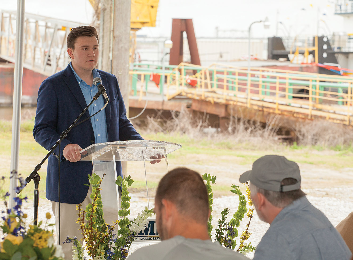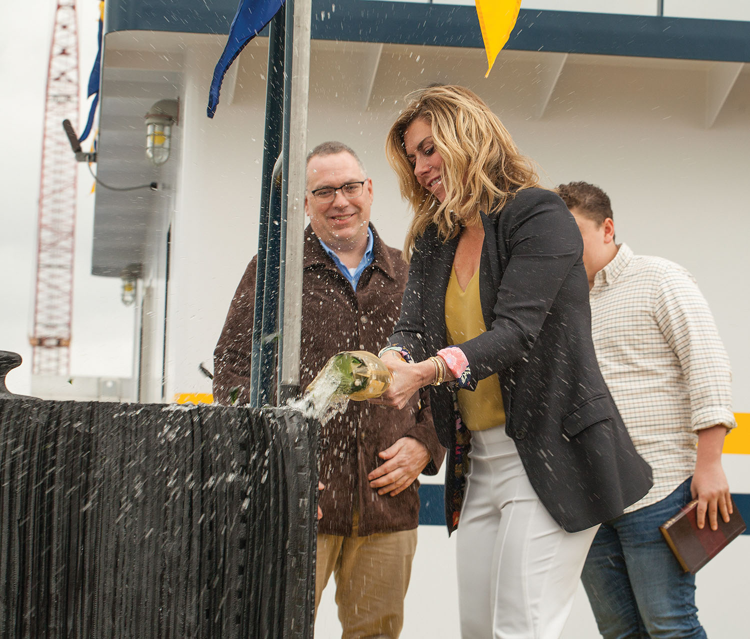 Aboard the vessel, Pastor Russ Cripps from Acacia Church in Baton Rouge offered a prayer of blessing for the Syble Fay and its crew. Moore’s younger son, Preston, presented Mazeika with the ship’s Bible. Then Angela Moore broke a bottle of champagne over the starboard push knee of the Syble Fay to officially christen it into the GMS fleet.