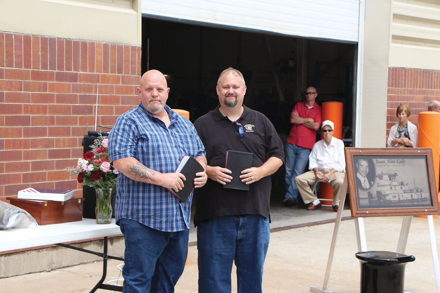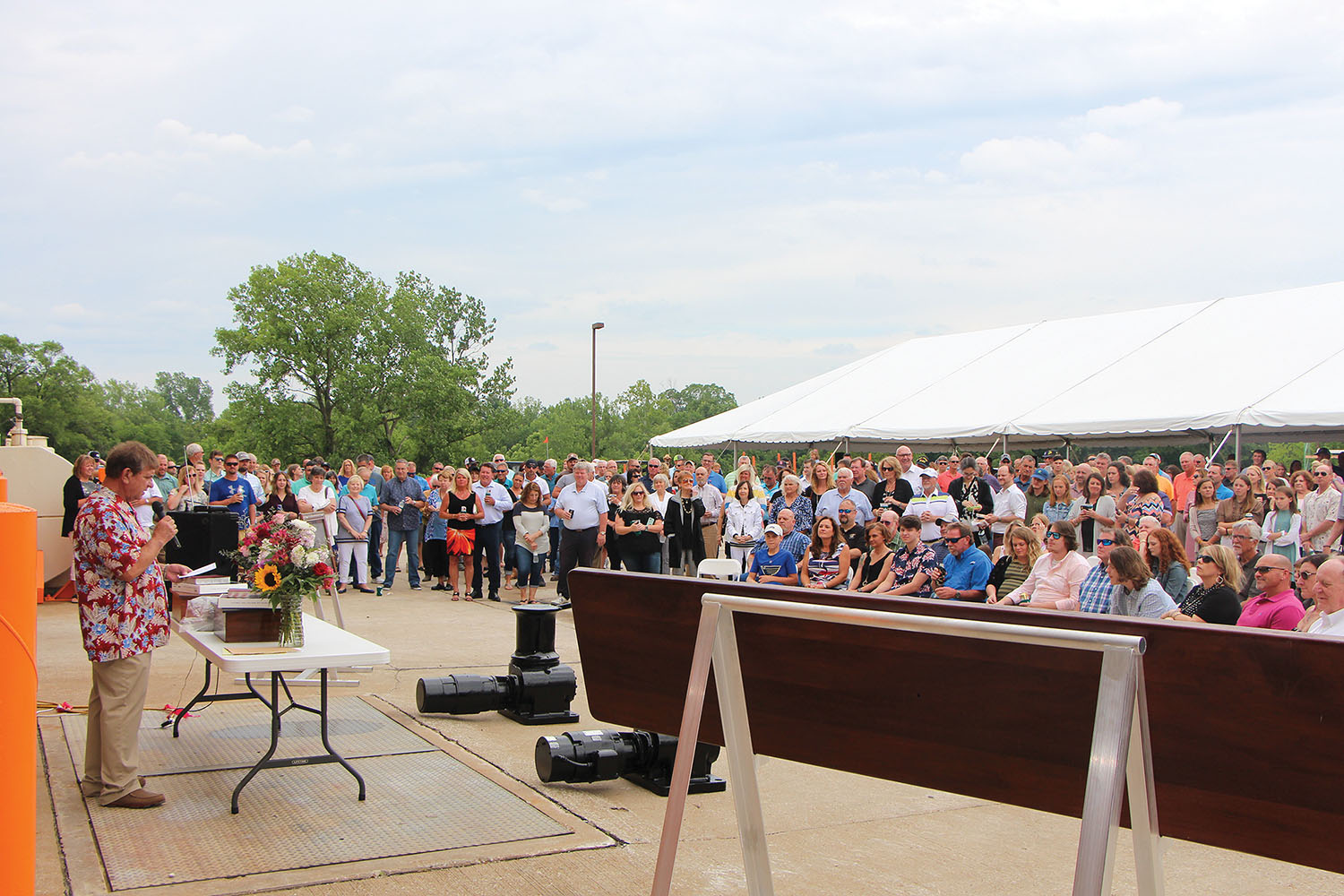 Luhr Bros. used two freshly painted capstans to represent the boats and give the sponsors a solid object over which to shatter the traditional champagne bottle, which they did at the direction of Mike Luhr, retired president, who emceed the christening.
