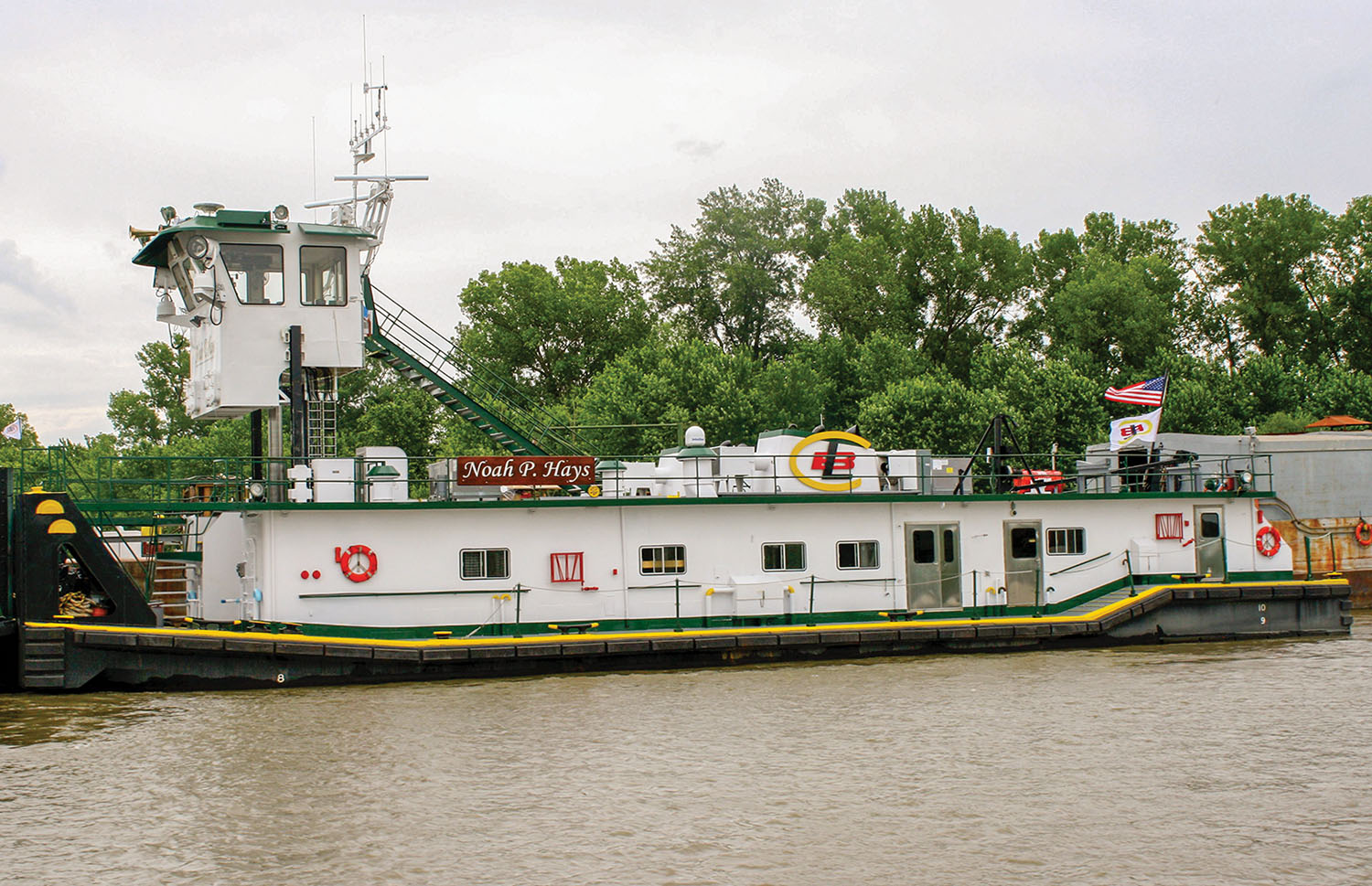 Neither boat is new, but neither had been formally christened. The Hays was built in 1985 by Jeffboat for Luhr Bros. as the Cletus, renamed The Mule in 2005 and then Noah P. Hayes. It is a 102-foot, 3,000 hp. towboat with a retractable pilothouse.