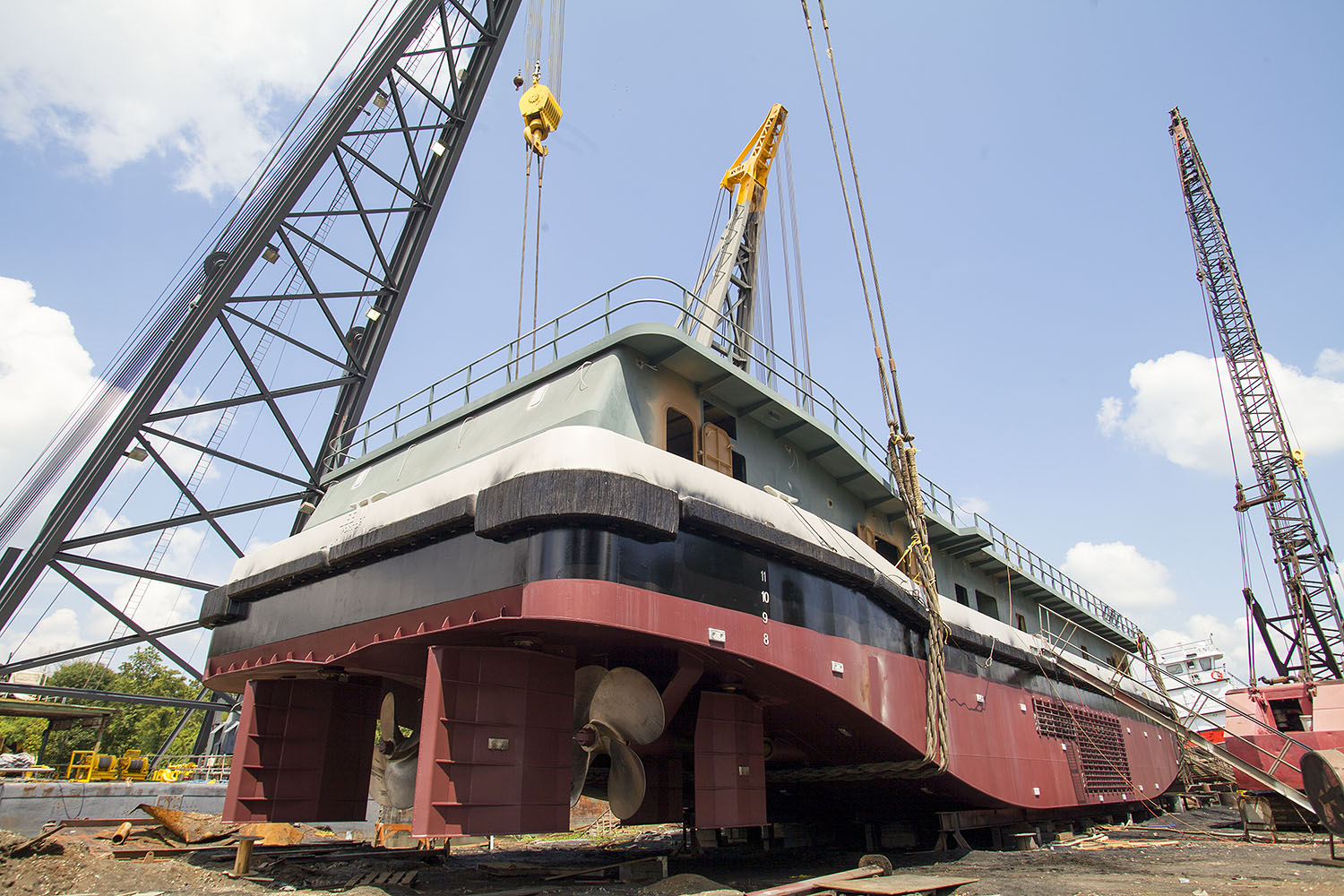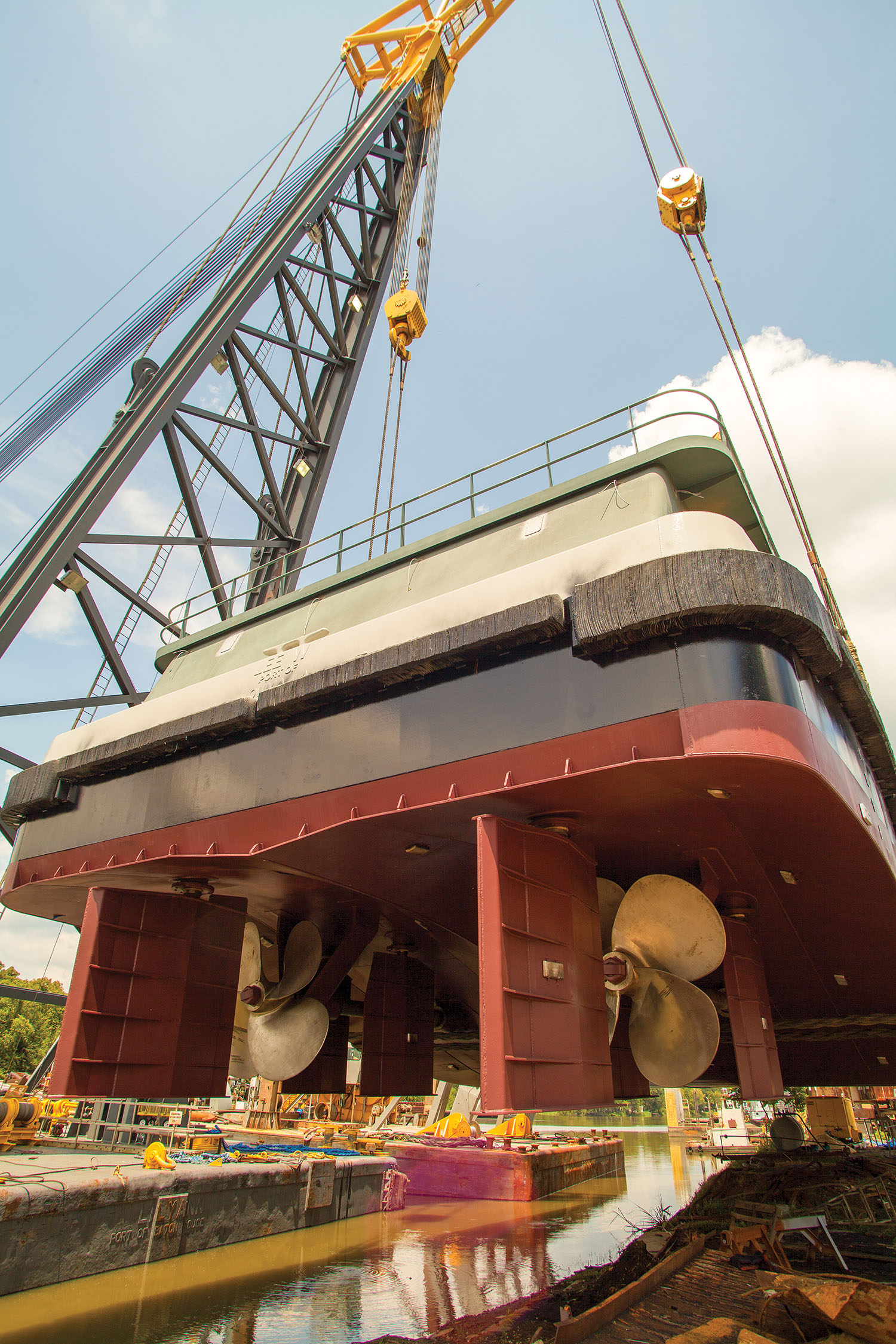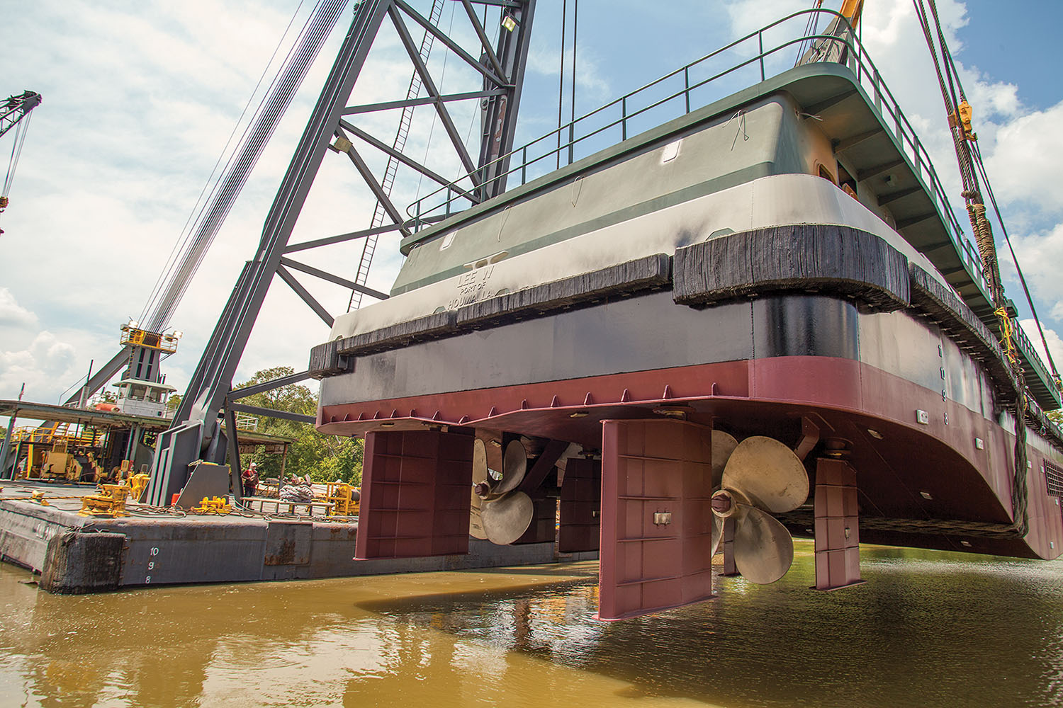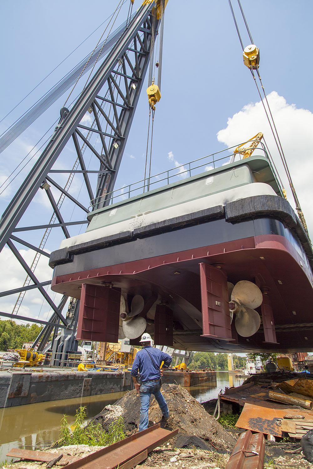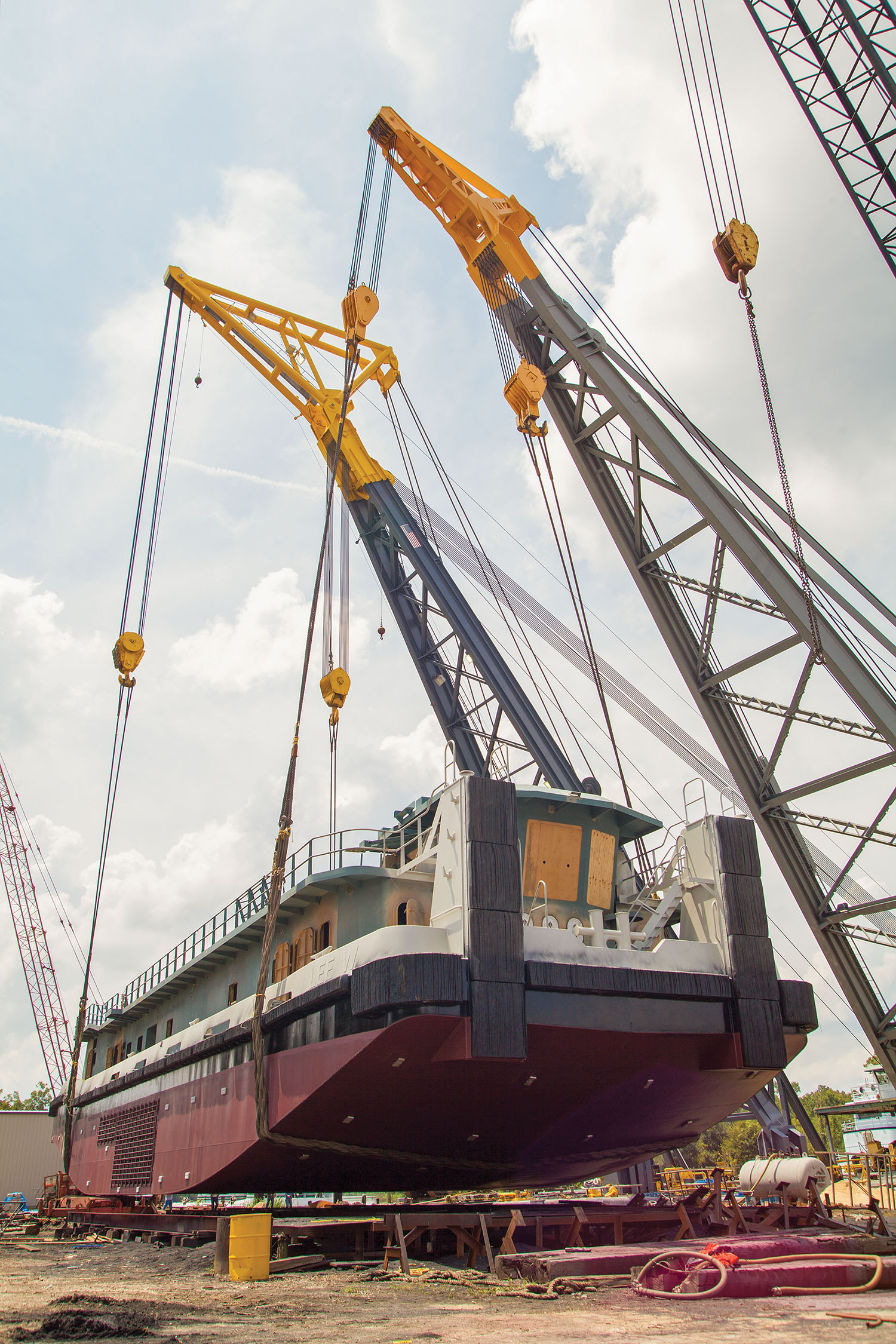 The Verret and McKinney crews were busy preparing to launch the mv. Lee W, a 138- by 38-foot towboat Verret is building for Enterprise Marine Services (EMS). After several hours of preparation, the crew from McKinney aboard the two derrick barges carefully cradled the mv. Lee W, lifted the vessel into the air, then pivoted out into the channel and plunged the 400-ton towboat’s hull into the water for the first time.