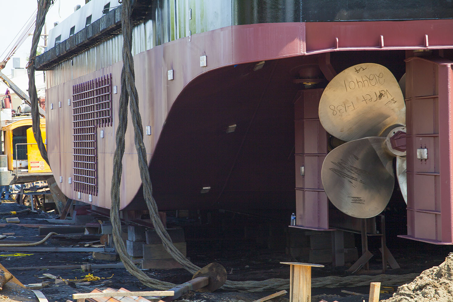 The Lee W will have 4,200 hp. from a pair of Caterpillar 3516 main engines, which will drive Reintjes gears from Karl Senner. The Lee W’s reduction gears will turn huge (102- by 86-inch) propellers at a ratio of 7.5 to 1.