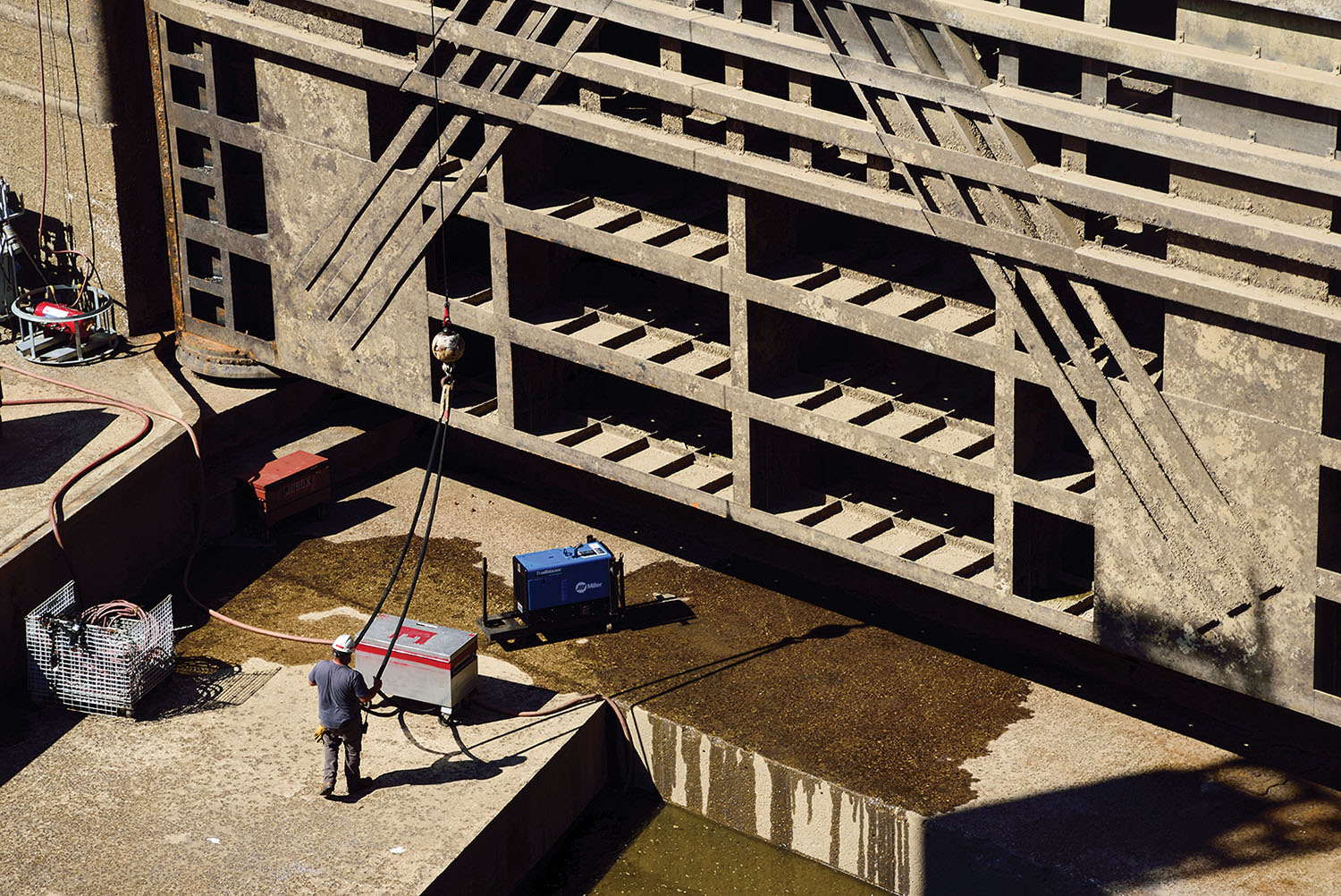 Caption for top photo: Repairs are underway to the upper miter gates on the main lock at the Robert C. Byrd Locks and Dam. The dam provides a 23-foot lift. (Photo by Jim Ross)