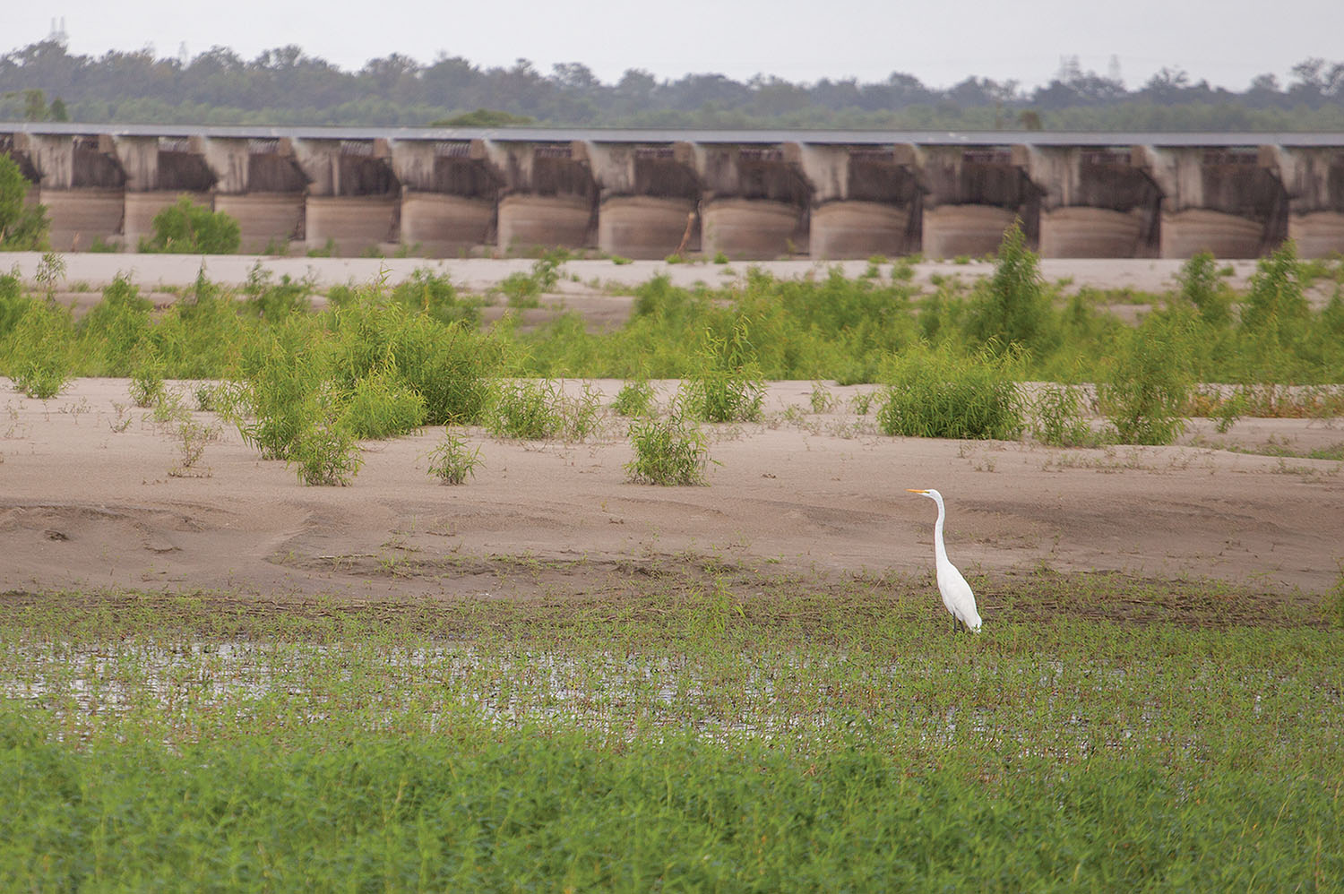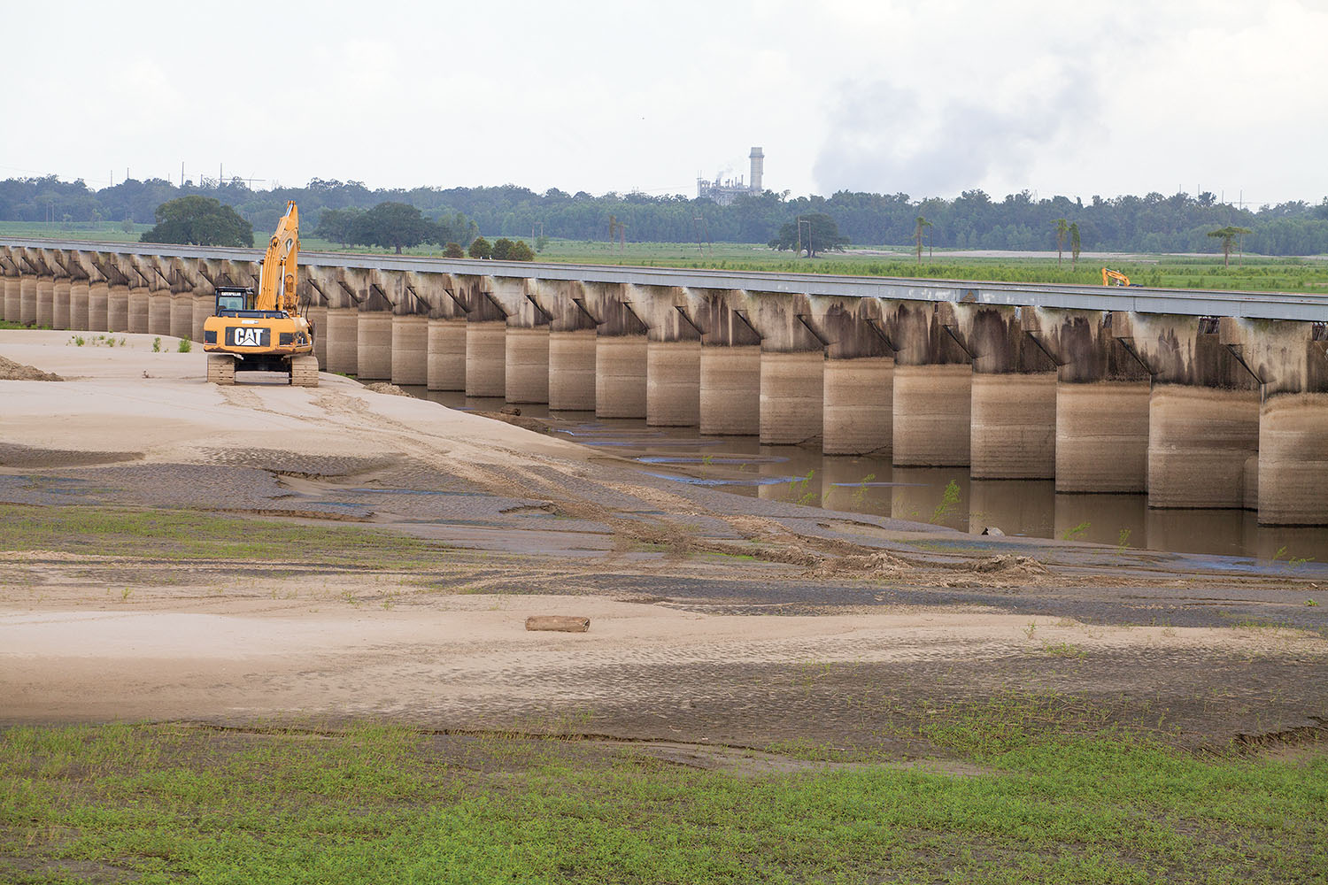 For months, the river side of the structure had looked like a bay, with no vegetation in sight. Throughout the course of the flood, the Mississippi River deposited vast amounts of sediment across the entire width of the Bonnet Carré Spillway’s forebay. Last week, a Caterpillar excavator was parked atop one of the dunes while egrets patiently hunted fish marooned when the river receded.