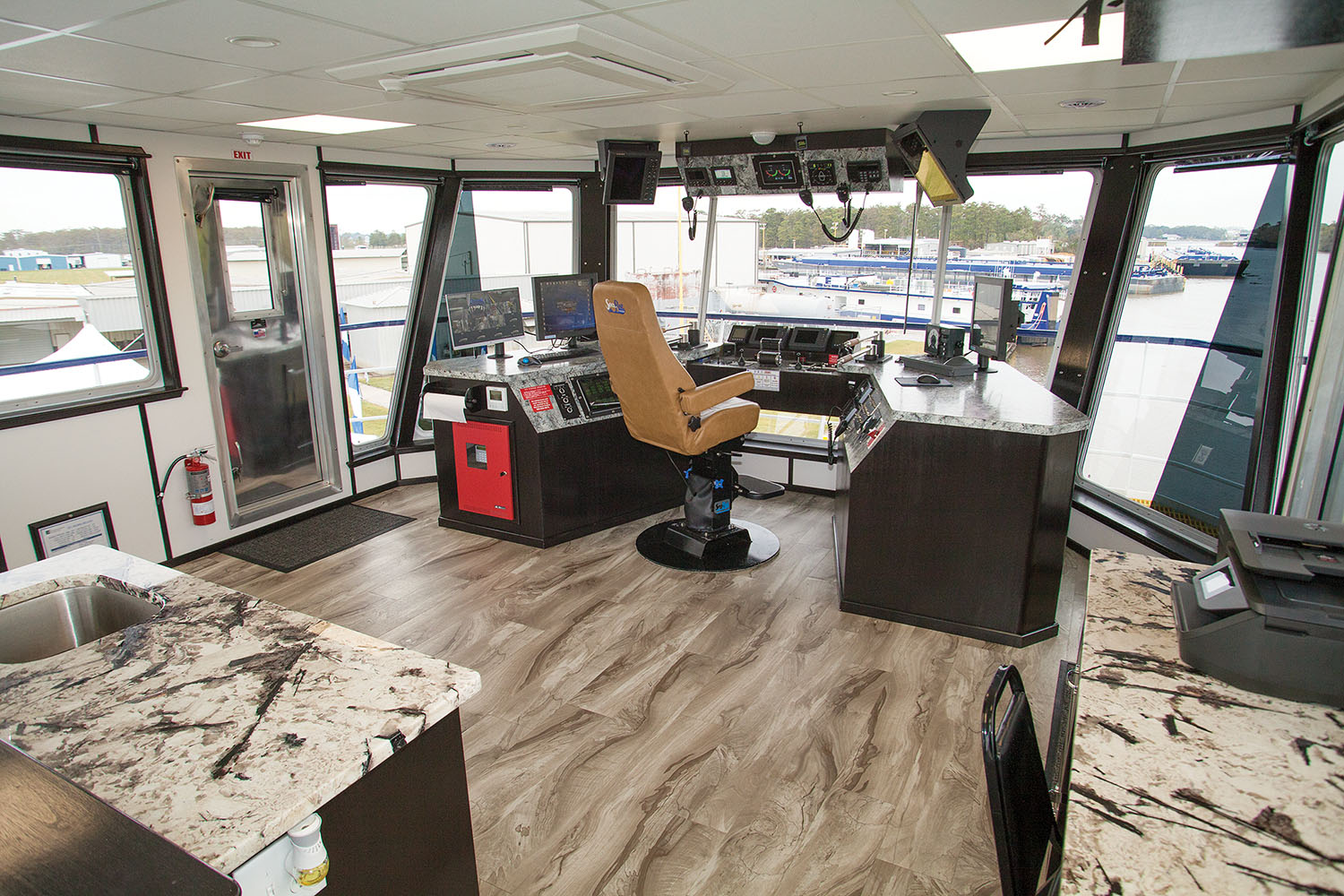 The towboat has five bedrooms, five bathrooms, an electronics room and a laundry room. The fully equipped galley features a stainless steel, 48-inch-wide range. The deckhouse has Mohawk Tybee Island plank flooring and custom paneling throughout. The pilothouse is equipped with Furuno FAR 2117 and Furuno FR 8062 radars along with a full set of other up-to-date electronic and communication equipment.