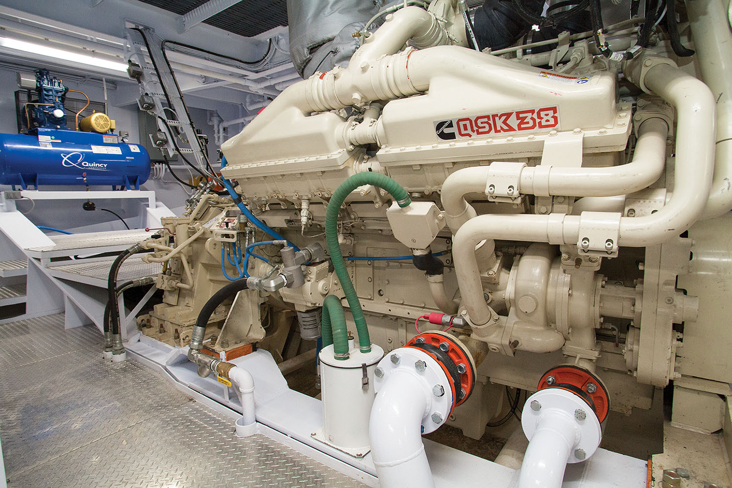 D’anna went on to detail the main features of the mv. Raymond Butler, which measures 84 by 32 feet, with an eye level of 34 feet, a molded depth of 11 feet, and a draft of 8 feet, 6 inches. The twin-screw towboat offers 2,600 hp. from a pair of Cummins QSK38M1 EPA Tier 3-compliant main engines from Cummins Marine. Ship service power is from two Cummins 99 kw. generators, also from Cummins Marine. Main engines are mated to Reintjes WAF 665 gears, with a 5.95:1 ratio and internal shaft brakes, from Karl Senner LLC. Those engines and gears turn four-blade, stainless steel Sound propellers (82-inch diameter and 62-inch pitch) from Texas Wheel Works Inc.