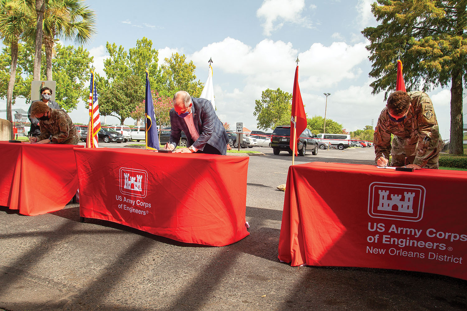 Ceremonial photographs from 2020 looked a little different from past years, thanks to the mask-wearing and social-distancing. But the COVID-19 precautions didn’t take anything away from the significance of this event: on July 31, Mississippi Valley Division Engineer Maj. Gen. Dianna Holland, Louisiana Gov. John Bel Edwards and New Orleans District Engineer Col. Stephen Murphy jointly signed a project partnership agreement for the long-awaited deepening of the Lower Mississippi River Ship Channel between Baton Rouge and the Gulf of Mexico. (Photo by Frank McCormack)