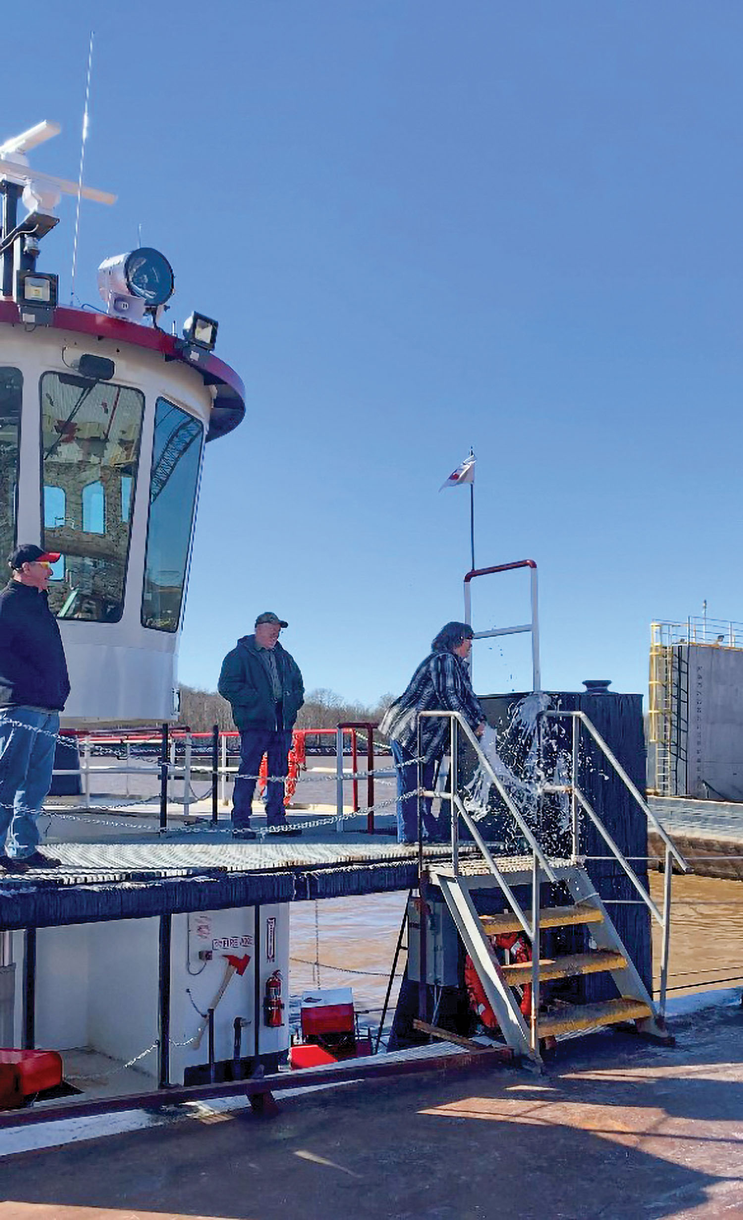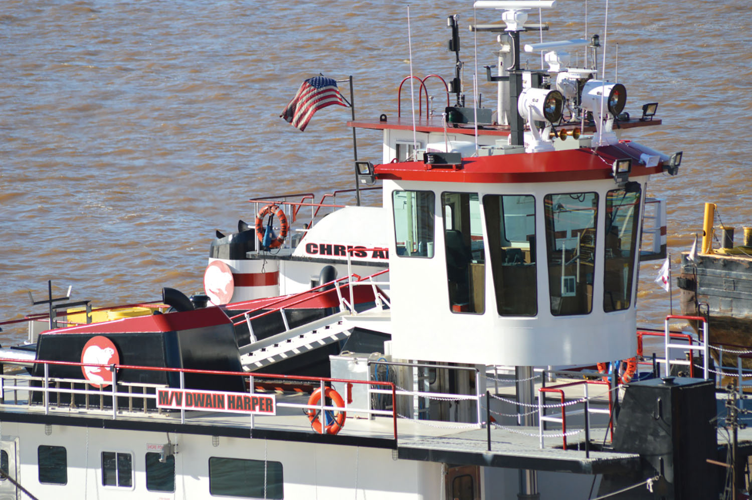 After a small celebration with family and co-workers, McGinnis Inc. officially christened the mv. Dwain Harper. Becky Harper, the namesake’s wife, broke the bottle with a single swing. The 1,600 hp. towboat was built at the firm’s Sheridan Shipyard, located in South Point, Ohio, at Ohio River Mile 320.4. Its namesake is the longtime manager of the yard and a dedicated member of the McGinnis team.