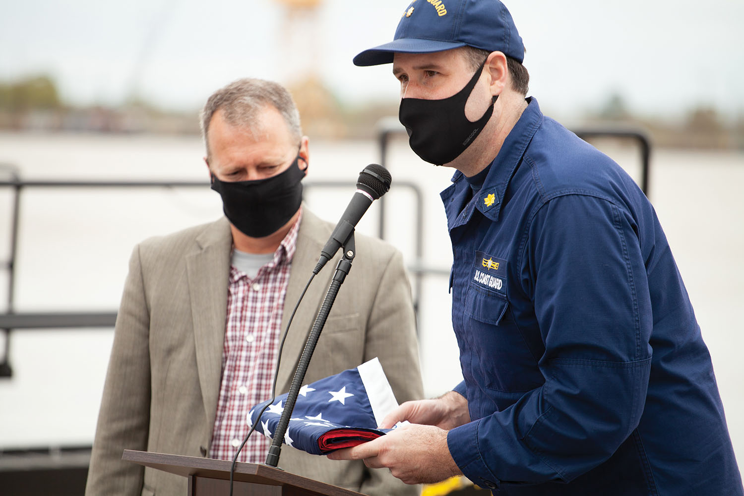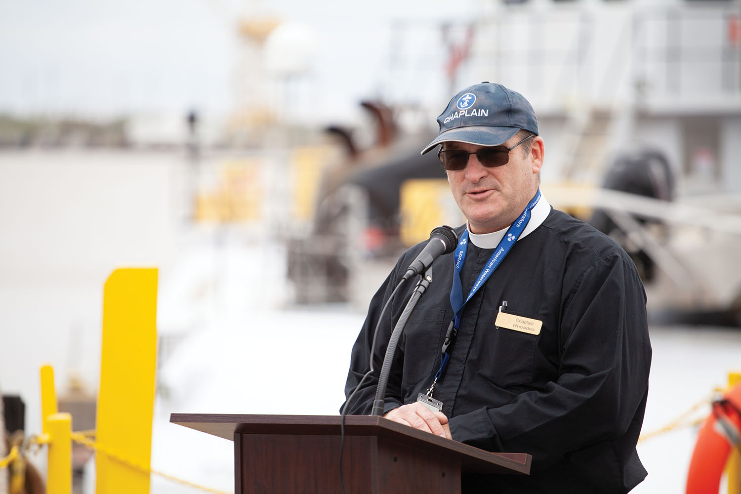 As part of the dedication ceremony, Tom Rhoades, Gulf region maritime and river chaplain for Seamen’s Church Institute, offered a prayer for the vessel and its crew and presented Nathan Basnett, captain aboard the mv. Mark L. Duplantis, with a Bible and the flag of the Merchant Marine. U.S. Coast Guard Lt. Commander Joe Hart then offered Basnett the American flag. Finally, Foster presented Basnett with the ACBL flag.