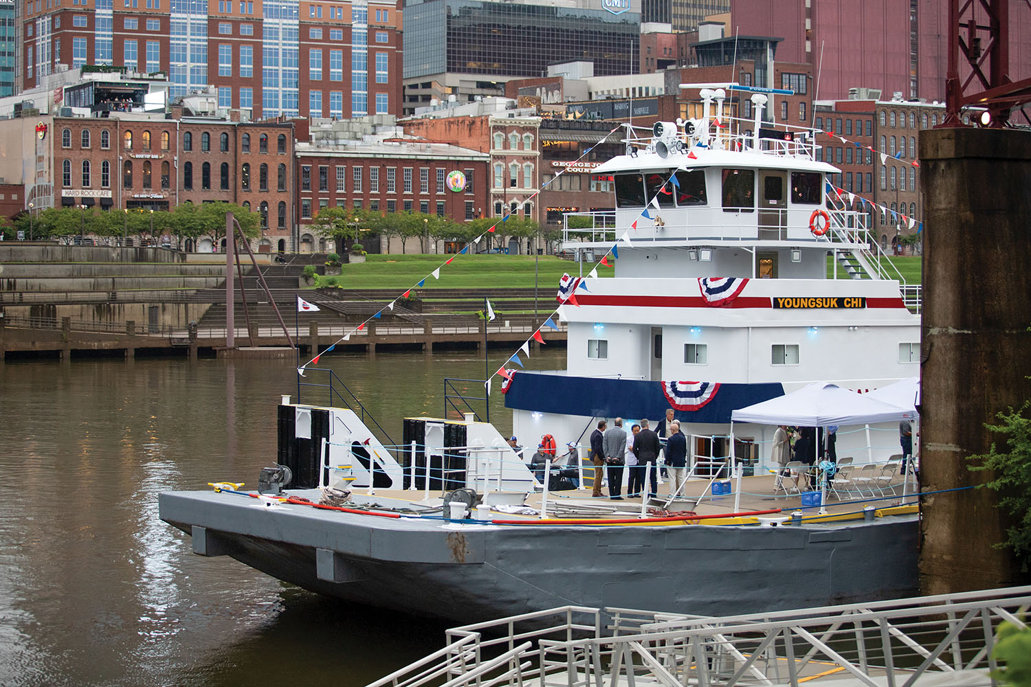 The towboat named for him, the Youngsuk Chi, is a 170-foot, 6,500 hp. vessel built by Jeffboat in 1966. Ingram acquired it from ACBL in 2012 and completely refurbished and repowered it in 2019 with EPA Tier IV GE engines.