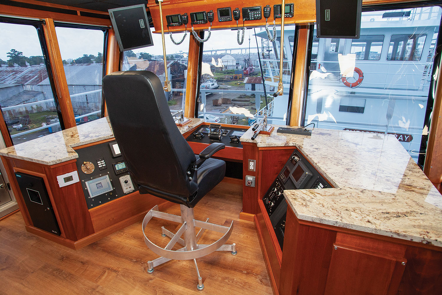 Inside the mv. Kyle Smith, the vessel has accommodations for seven crew members in five staterooms and four bathrooms. The vessel’s electronics package is by Wheelhouse Electronics. American Fire Safety & Supply provided the mv. Kyle Smith’s galley fire suppression system, with Donovan Marine supplying the other firefighting equipment on board. Dale’s Welding supplied the aluminum doors.