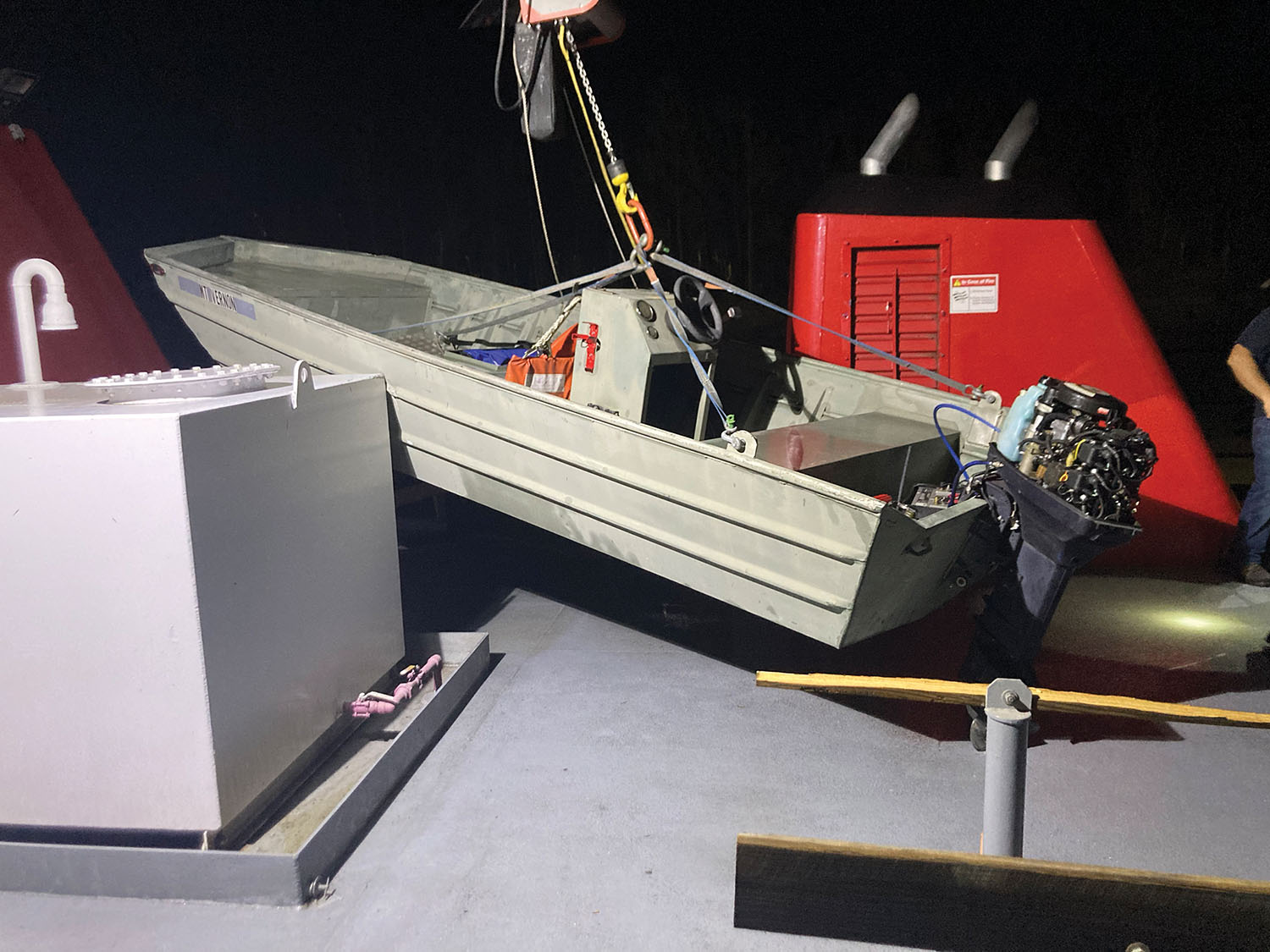The whipping wind wrecked the boat’s grills and smokers. The worst damage was to the yawl, the small, metal jon boat that normally stays attached to a crane and rests on its own stand on the deck.