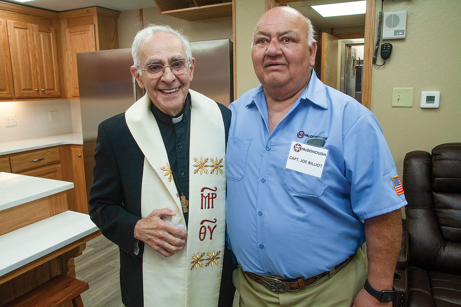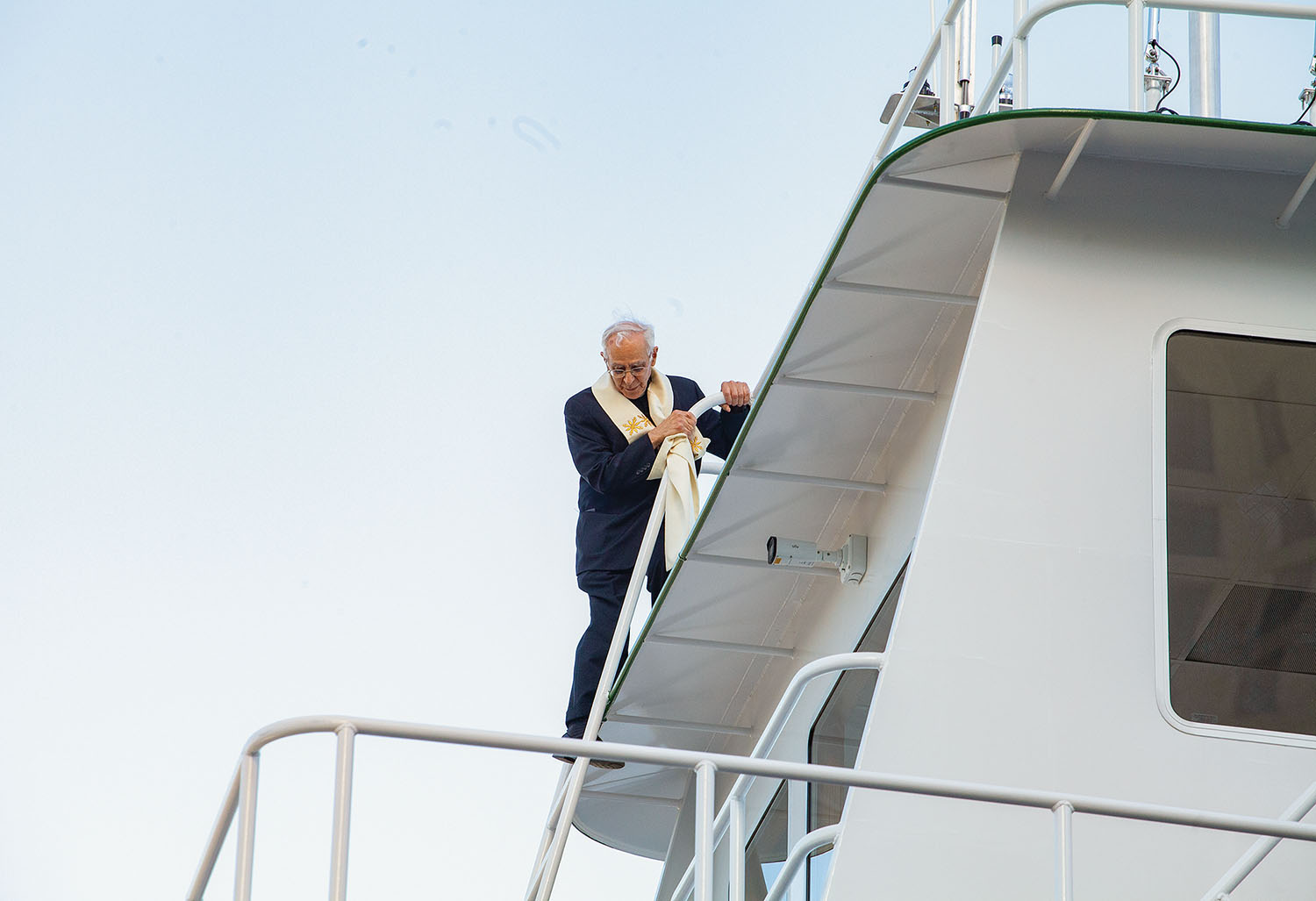 Verret presented the crew of the Alma Grace with the vessel’s bell. Afterward, the Rev. George Hanna from St. Rosalie Church in Harvey, La., presented the ship’s Bible and cross. After a blessing and reading of scripture, Hanna proceeded to sprinkle the boat with holy water.