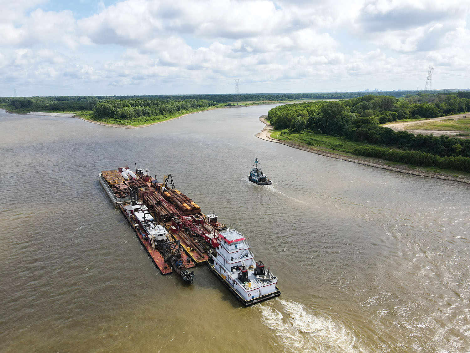Caption for top photo: The Great Lakes Dredge & Dock Company dredge Iowa dredges in New Madrid County Harbor in 2021. The Memphis Engineer District has contracted with GLDD to dredge nine harbors in 2022. (Photo courtesy of Great Lakes Dredge & Dock)