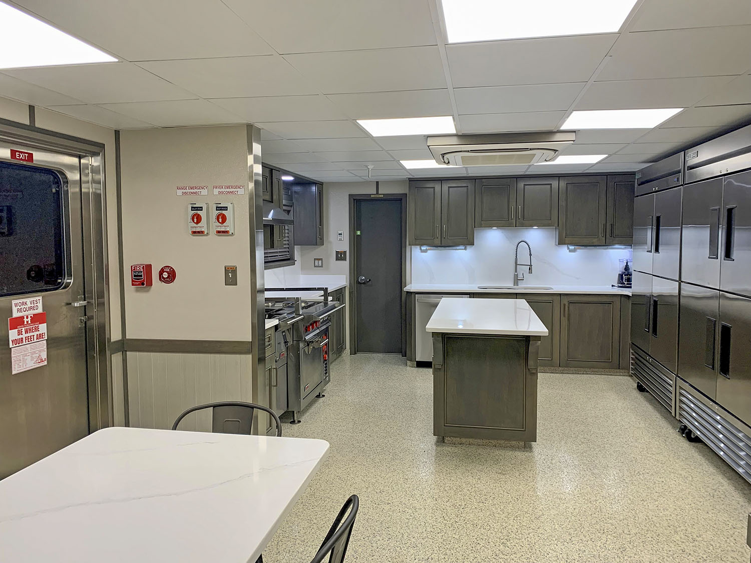 Work on the interior of the Capt. Tubbs featured completely new carpentry by McGarity Cabinets. The interior consists of dark oak paneling in the pilothouse, gray marlite paneling and wood furniture in the crew quarters, drop tile ceilings throughout and epoxy chip style flooring in the galley, together with white marbled quartz countertops and backsplash.