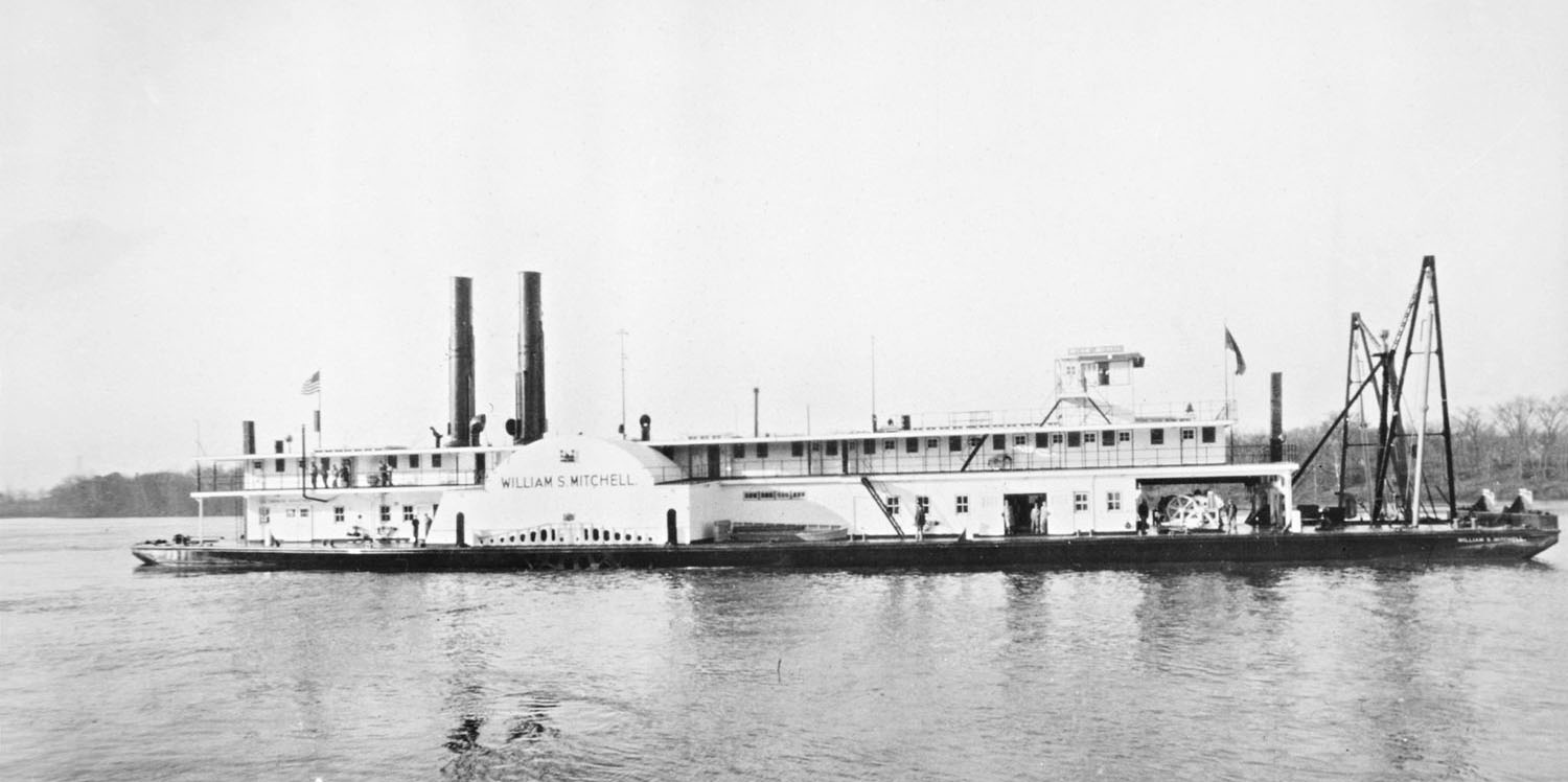 The October 6, 1934, issue of The Waterways Journal carried a story on Page 5 headlined: “Huge Dredge Mitchell Launched in 11 Seconds.” The article stated that the dredge, named William S. Mitchell, weighed more than 1,470 tons, making it the heaviest craft ever launched by the builders, the Marietta Manufacturing Company of Point Pleasant, W.Va. Some 1,500 people witnessed the event.
