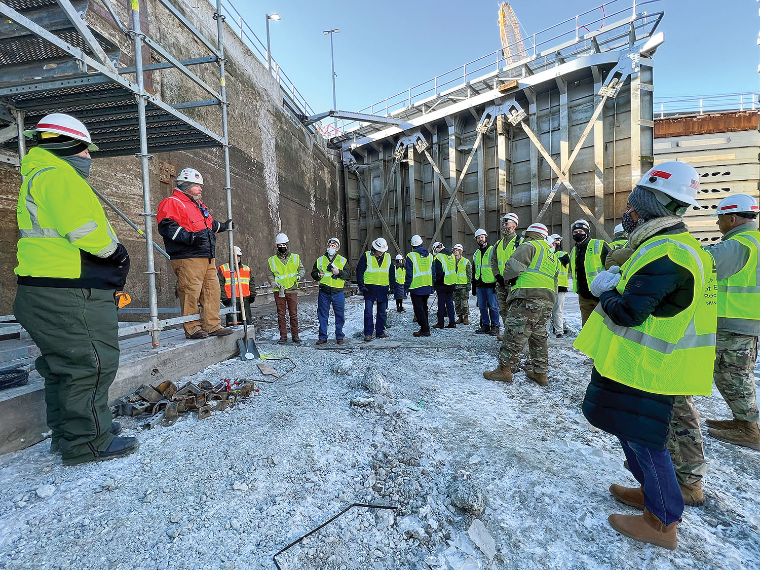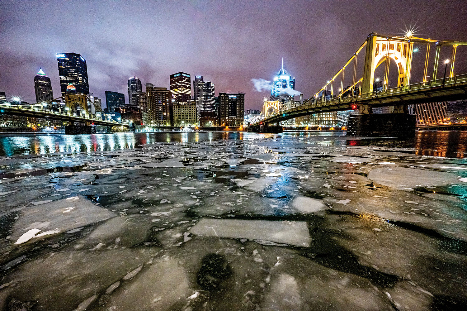This Corps of Engineers photo shows ice forming on the Allegheny River in Pittsburgh, Pa., on January 25. Ice is a recurring concern in the winter for industries that rely on navigation to transport commodities. To get ahead of the navigation impacts, the Ice Hydro Committee is composed of members from the Coast Guard, Corps, National Weather Service, Waterways Association of Pittsburgh and other stakeholders. (Photo by Michel Sauret/Pittsburgh Engineer District)