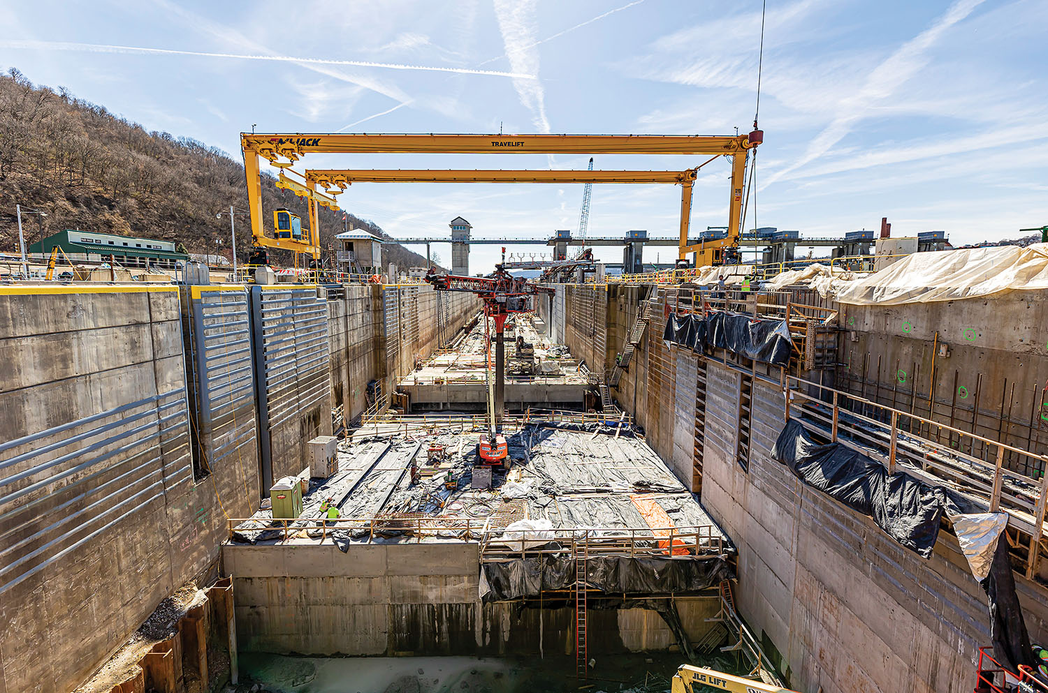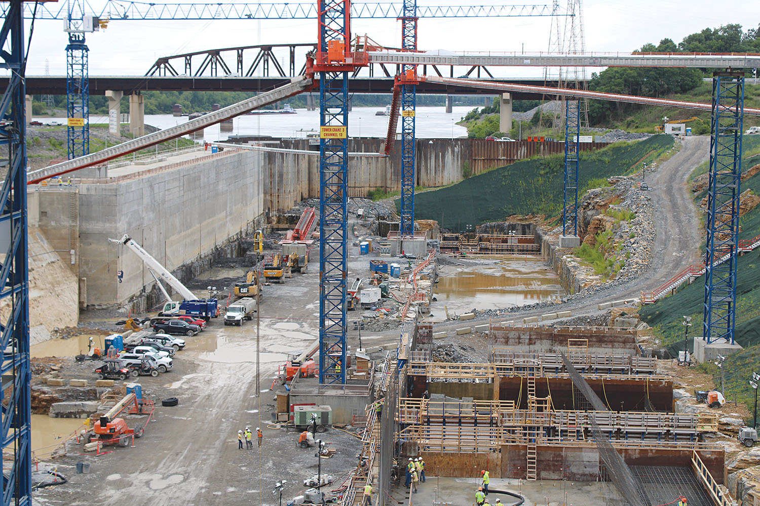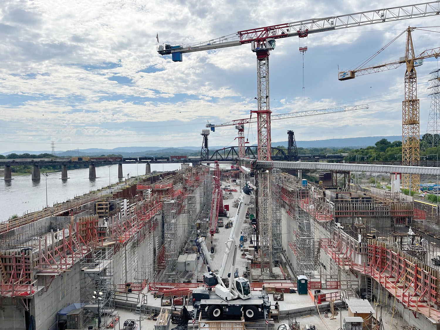 Construction continues apace on the new lock at Chickamauga Lock and Dam. Capt. Joseph Cotton, the Nashville Engineer District’s project manager, gave Tennessee River Valley Association members an update at their meeting in October; he said 200,000 cubic yards of concrete of the 250,000 that will be needed have already been placed. The project, though, is just about 46 percent complete. This photo shows the lock as of September. (U.S. Army Corps of Engineers photo)