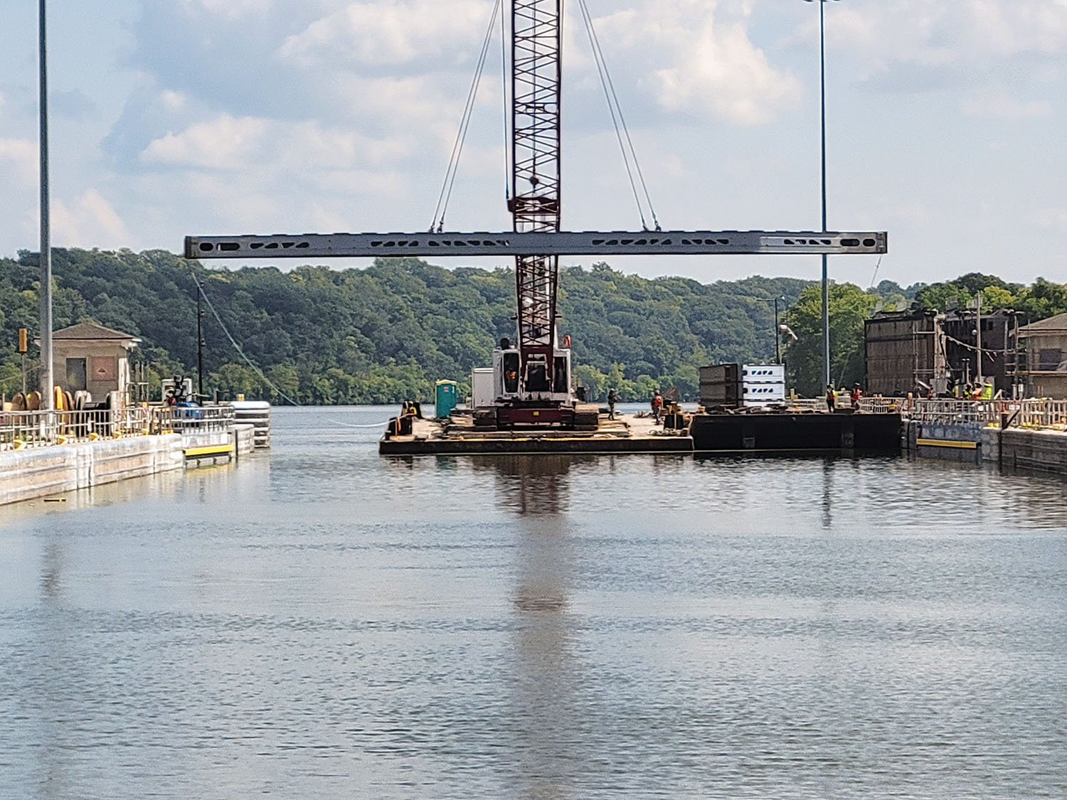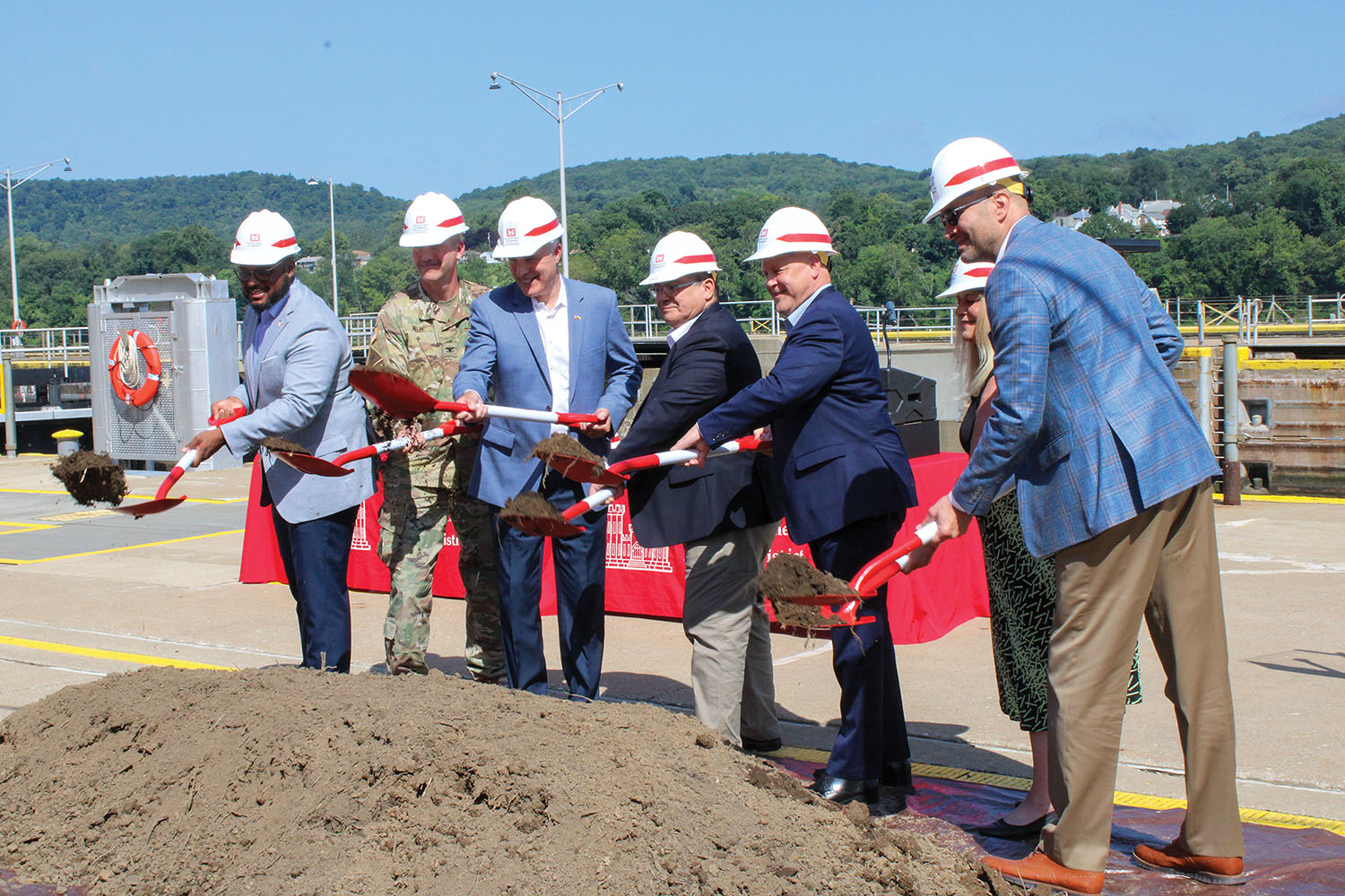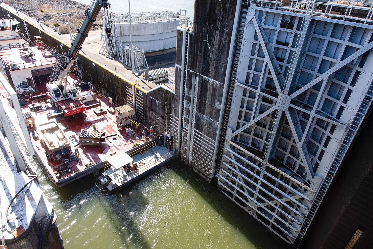 Construction continues apace on the new lock at Chickamauga Lock and Dam. Capt. Joseph Cotton, the Nashville Engineer District’s project manager, gave Tennessee River Valley Association members an update at their meeting in October; he said 200,000 cubic yards of concrete of the 250,000 that will be needed have already been placed. The project, though, is just about 46 percent complete. This photo shows the lock as of September. (U.S. Army Corps of Engineers photo)