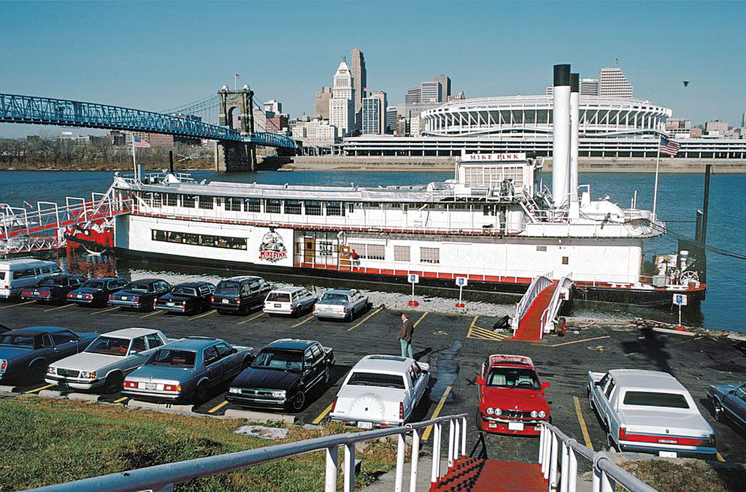 In 1977, the floating restaurant was sold to the Bernstein family, and it became an immensely popular venue. For several Cincinnati Tall Stacks events the pilothouse of the vessel was utilized for those working in the event “Traffic Control,” monitoring the movements of the excursion vessels and coordinating commercial traffic through the bridges area. As one who worked in this capacity, it was somewhat surreal to sit there and envision what it might have been like for Capt. Vernon Byrnside to gaze out that front window when the boat was new.