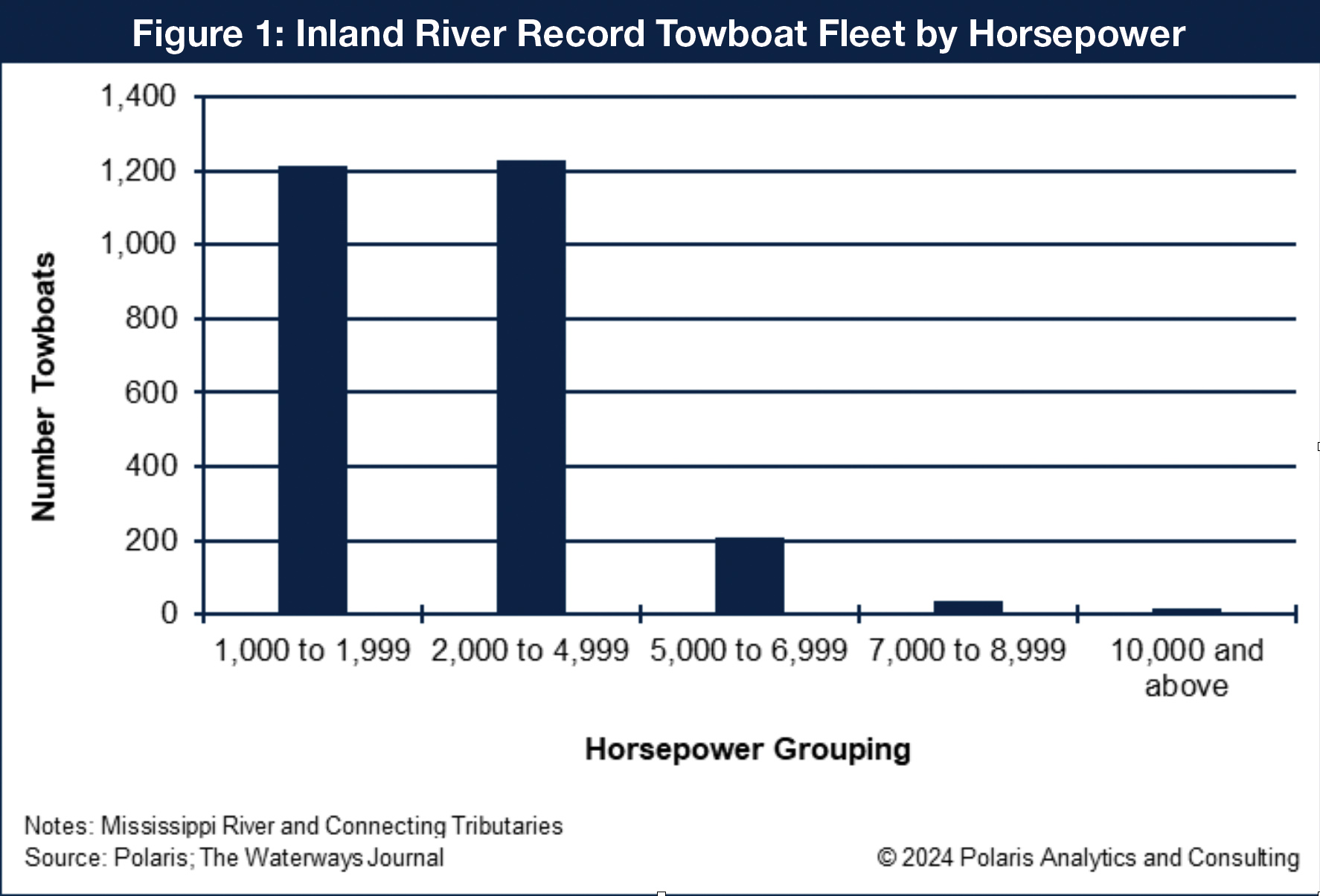 Larger towboats with greater horsepower capability serve mainline runs and are dedicated to a river segment and tow size. For example, the 5,000 hp. to 6,999 hp. grouping largely serves the dry hopper barge fleets of the locking rivers (above St. Louis on the Mississippi River or on the Ohio River). These towboats will be pushing 15-barge tows.