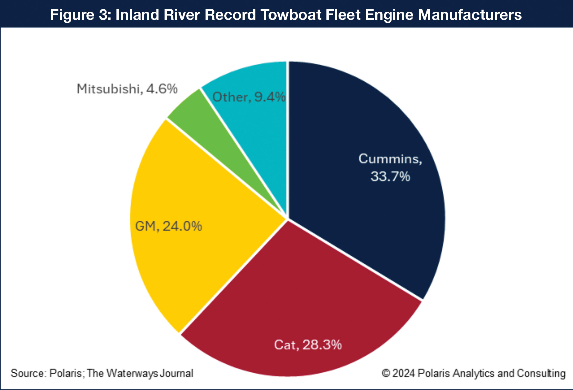 The majority of towboats are powered, essentially, by one of three major engine manufacturers: Cummins, Caterpillar or General Motors. Together, these three manufacturers represent 86 percent of the number of engines powering towboats on the inland river system. A fourth company, Mitsubishi, has 4.6 percent of the market share. Some towboat owners might vector to one manufacturer over another. Some manufacturers may have more engines on the lower horsepower spectrum, while others focus more on the higher end of the spectrum. The distribution of engine manufacturers with engines in towboats on the inland river system is shown in Figure 3.
