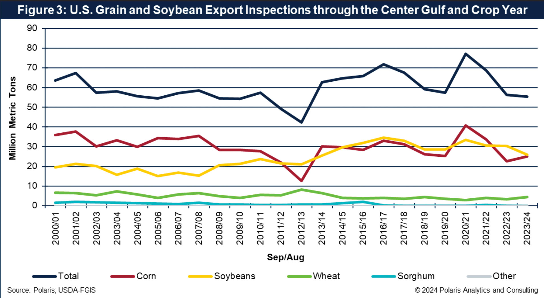 Grain and soybean exports by crop, and overall are shown in Figure 1.