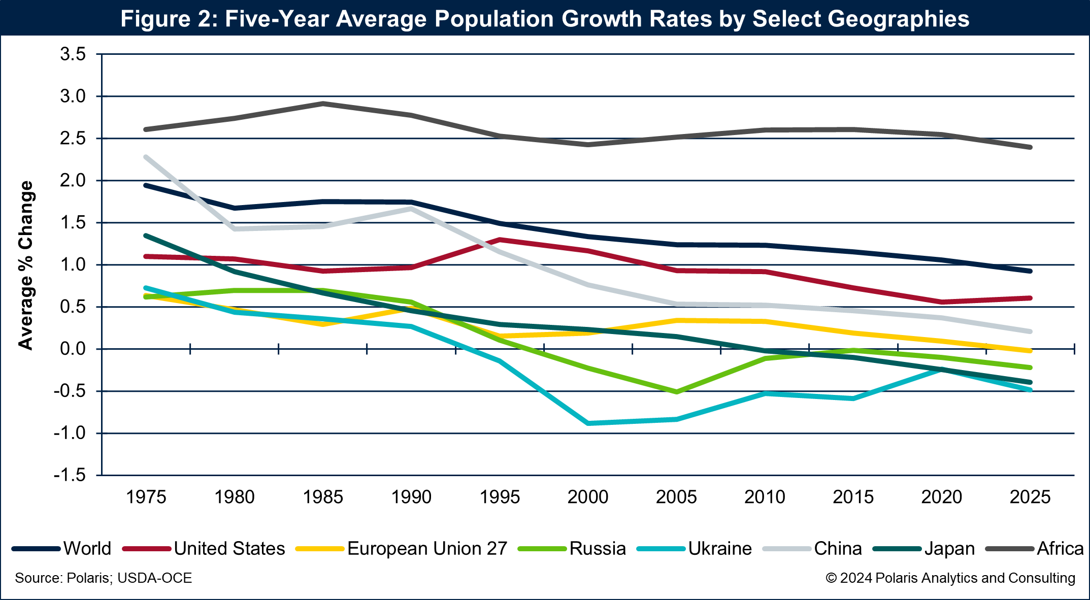 The five-year growth rate in the United States is expected to average 0.6 percent through 2025, down from 1.2 percent in 2000. The European Union 27’s five-year average population growth rate is already negative and will average -0.2 percent through 2025. Russia’s average growth rate turned negative in 2000, while Ukraine’s did so in 1995. With the ongoing war in Ukraine, population growth in those countries will remain negative.