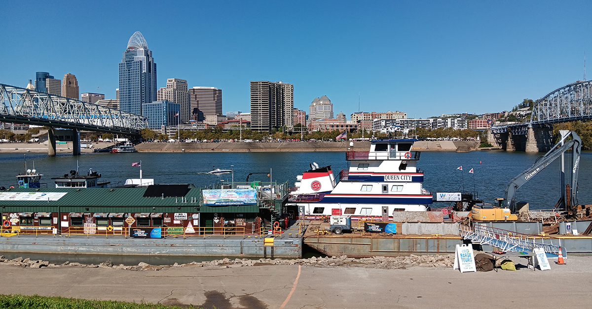 Featured image caption: A view of the Living Lands & Waters Mississippi River Institute barge moored on the Newport, Ky., riverfront during the America’s River Roots Festival. (Photo courtesy of Living Lands & Waters)