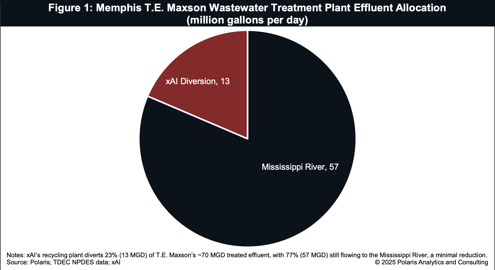 Here is where math matters. Maxson’s effluent, if not diverted, adds about 70 million gallons per day to the Mississippi River. xAI’s diversion of 13 million gallons per day reduces this by about 23 percent, or 4.7 billion gallons annually.