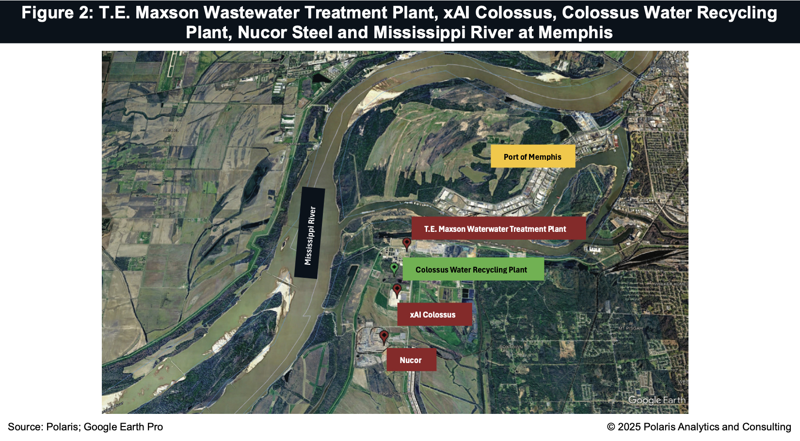 Enter xAI’s Colossus, recognized as the world’s largest AI supercomputer, humming in south Memphis with more than 200,000 Nvidia GPUs (and eventually increasing to 1 million). Its cooling needs are immense, requiring up to 13 million gallons per day to keep chips from overheating. Currently, it draws 1.3 million gallons per day from the Memphis Sand Aquifer, but xAI plans to tap another source: an $80 million Colossus Water Recycling Plant that broke ground on October 10 and will be operational during late 2026. This facility will pull 13 million gallons daily of treated effluent from the nearby T.E. Maxson Wastewater Treatment Facility, which processes about 70 million gallons a day of municipal wastewater—water that would otherwise flow into the Mississippi River as shown in Figure 1. The T.E. Maxson Wastewater Treatment Facility, Colossus Water Recycling Plant, xAI Colossus, Nucor, the Port of Memphis and the Mississippi River are shown on the map in Figure 2.