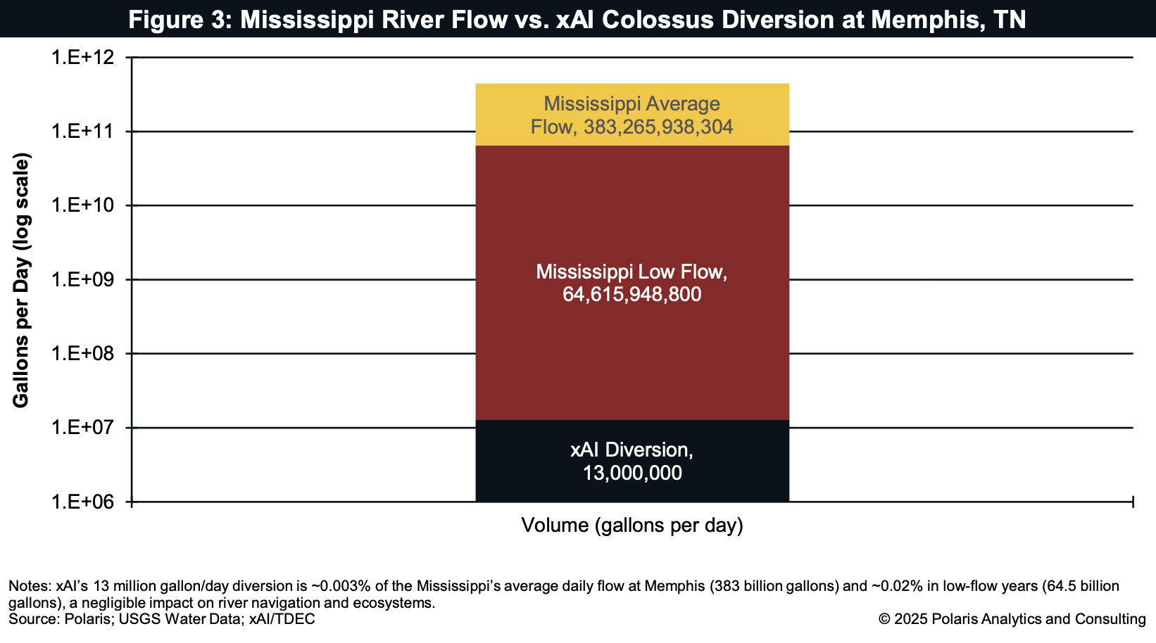 At 593,000 cfs, the river carries about 383 billion gallons daily past Memphis. xAI’s diversion is a mere 0.003 percent of that flow as shown in Figure 3, akin to a drop in a bucket the size of Beale Street. Even in low-flow conditions (100,000 cfs), the impact remains negligible, ensuring no threat to navigation or ecosystems.