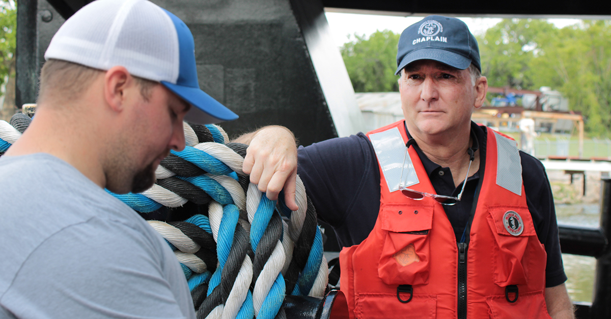 Featured image caption: SCI President and Executive Director Mark Nestlehutt visits with a mariner aboard a towing vessel. (Photo courtesy of the Seamen’s Church Institute)
