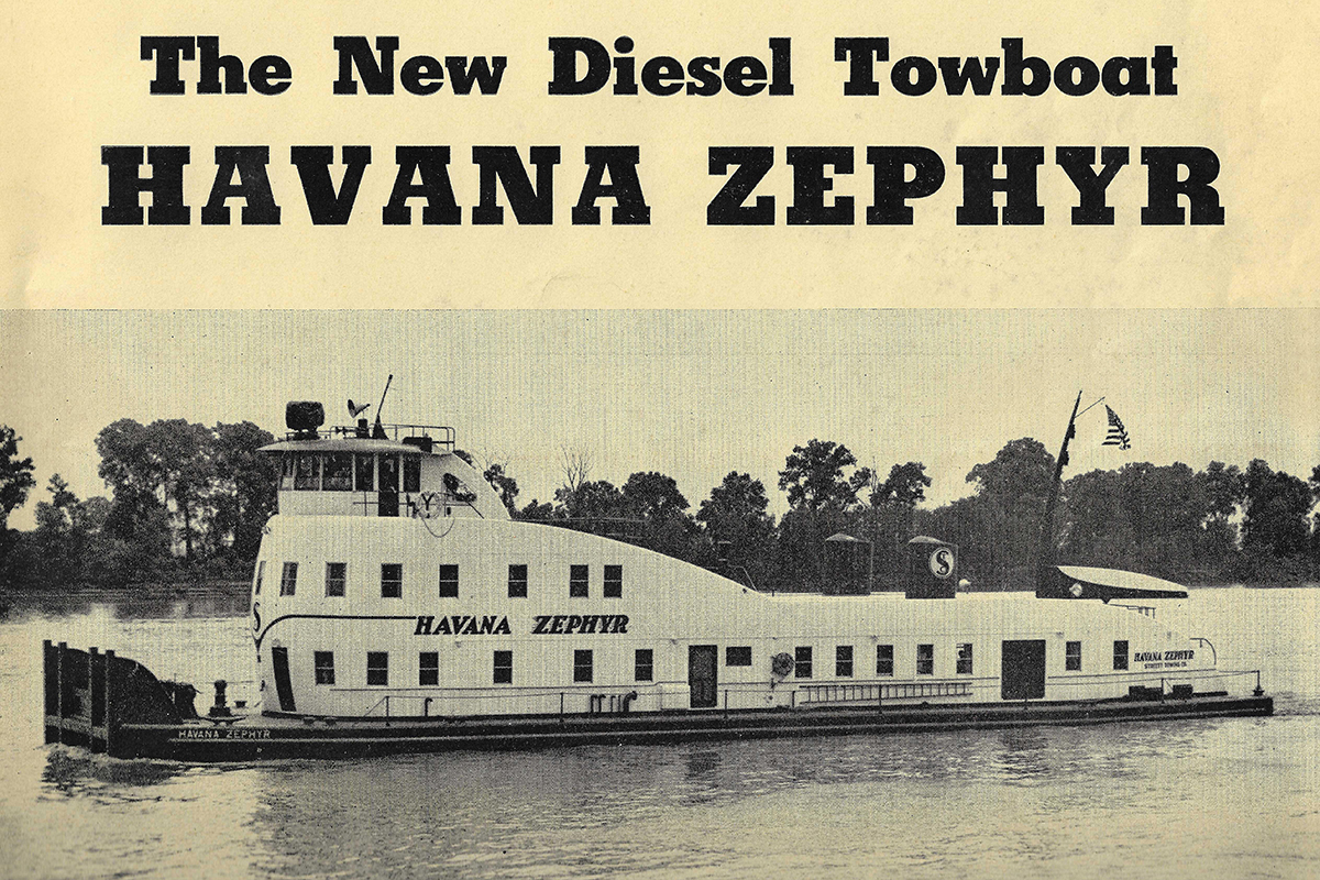The June 1, 1946, issue of The Waterways Journal carried a feature story on the new Streett Towing boat named Havana Zephyr. The article began by saying that “folks who know river boats” would be able to tell at a glance that it had been built by St. Louis Ship due to its “distinctive and modern appearance.” A unique feature of the boat was that the front of the cabins formed “a half-spherical shape and tapers back in long easy curves to form one of the most graceful boats on the river.” The front of the pilothouse was rounded as well. The 126-foot by 29-foot hull had a “model-scow” bow and was fitted with a skeg designed by St. Louis Ship to increase thrust.