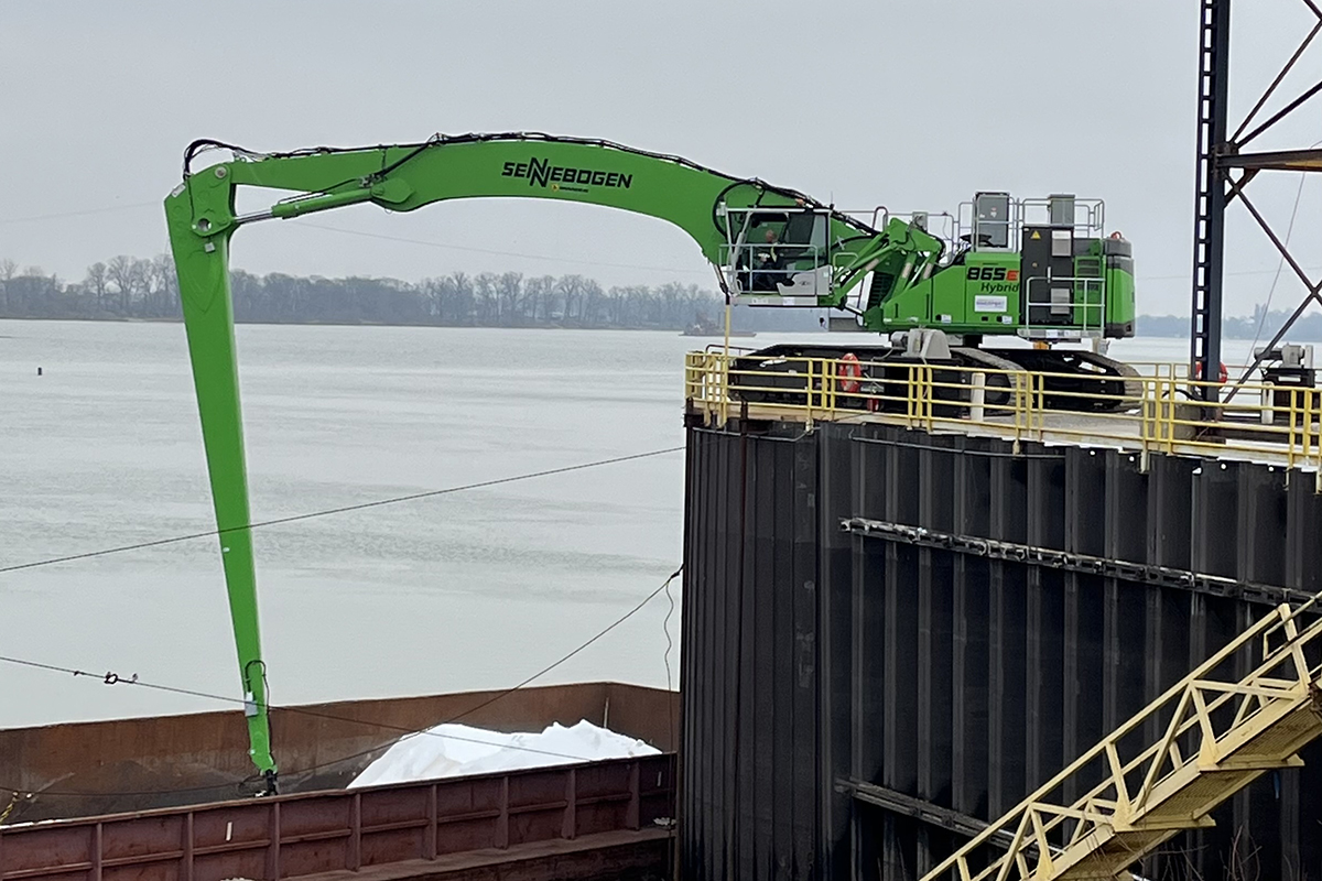 The facility, Ohio River Mile 808, acquired a new $2.03 million Sennebogen 865E electric material handler capable of offloading dry bulk cargo at the liquid bulk dock rather than the main dock. It allows the riverport to unload two barges simultaneously, easing seasonal bottlenecks and reducing demurrage costs for customers.