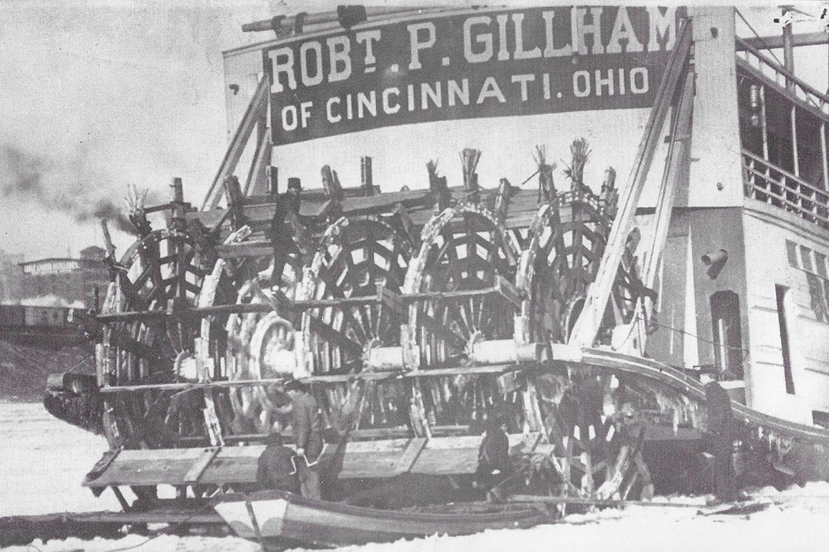 Wooden hulls such as the one on the Gillham were very susceptible to damage by heavy ice. The “big ice” of 1918 saw many wood hull steamboats cut down and destroyed, including the celebrated sidewheelers City of Louisville and City of Cincinnati, large packets owned by the Louisville & Cincinnati Packet Company to run between those two cities. The City of Louisville, built by Howard at New Albany, Ind., in 1894 had a wood hull that was 301 feet by 42.7 feet and Frisbie engines with 30-inch cylinders and a 10-foot stroke. Soon after entering service, it set a record time of nine hours, 42 minutes running from Louisville to Cincinnati. That record stands to this day. For many years afterward, it carried a sign on each side of the pilothouse stating “9-42.”