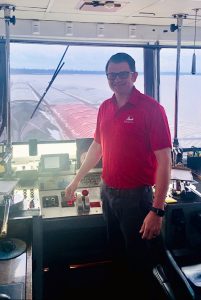 From his first days as a deckhand, Sanford knew his eventual destination should be the wheelhouse, and he was eager to get there. After serving as a deckhand trainee his first hitch, on the mv. Loree Eckstein (now the Marquette Mariner), he moved up to deckhand. The crew on the Mary Kay Eckstein asked him to be a regular, and it didn’t take long for him to be senior deckhand and then lead man. About a year later, when the relief mate left, Sanford was offered and accepted his position.