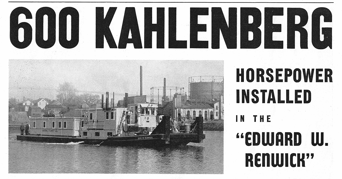 The boat was named Edw. W. Renwick and was featured in the August 26, 1939, issue of the WJ with the headline: The Edw. W. Renwick: A Model Towboat. This piece said that the “most unusual job” that the generators had to do was “to power the hydraulic controls for adjusting the height of the pilot house.” With the structure down and the “stacks unmounted,” the Renwick had a height of 13 feet, 7 inches.