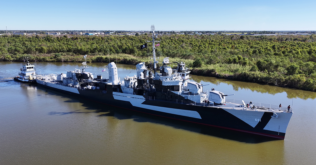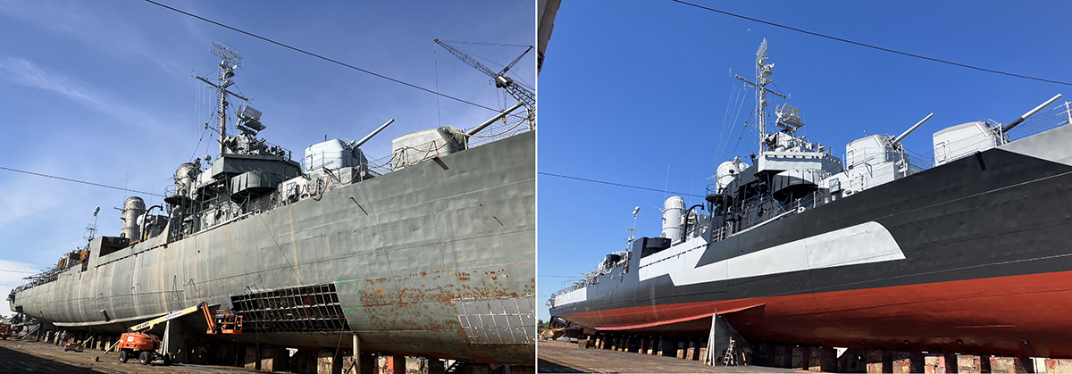 Featured image caption: The U.S.S. Kidd in its new “dazzle camouflage” paint, the same colors in which the ship would have appeared in 1944 during World War II. The ship will retain the paint scheme for the next five years before returning to its typical August 1945 camouflage. (Photo courtesy of Hunter Svetanics/Johnson Marine)