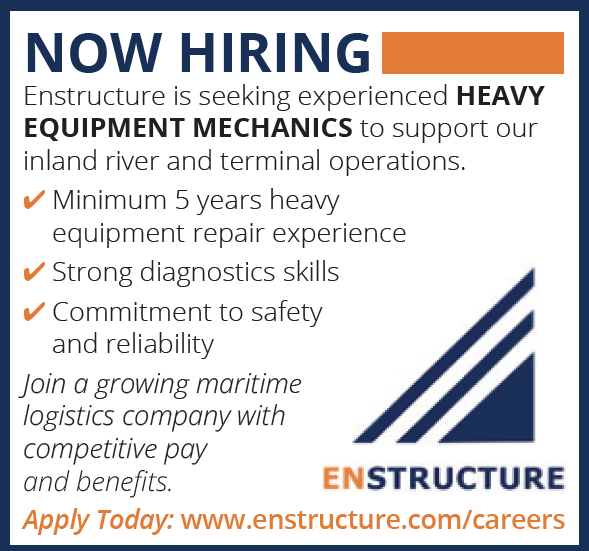 NOW HIRING: HEAVY EQUIPMENT MECHANICS – Entructure is seeking experienced HEAVY EQUIPMENT MECHANICS to support our inland river and terminal operations.