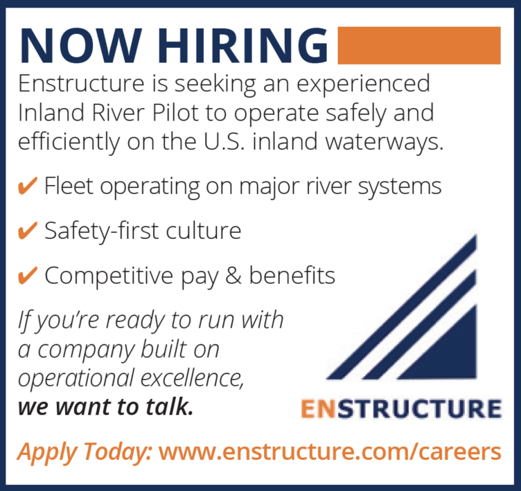 NOW HIRING: INLAND RIVER PILOT – Enstructure is seeking an experienced Inland River Pilot to operate safely and efficiently on the U.S. inland waterways