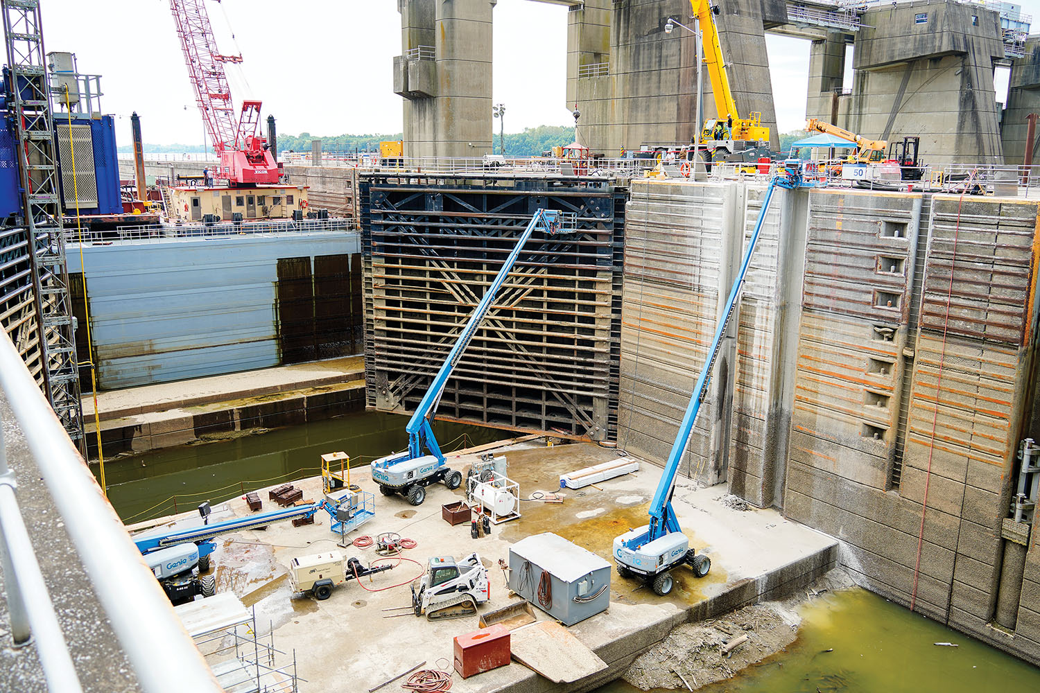 Cranes lifted miter gate leaves high in the air as a five-month closure of the north lock chamber got underway recently at McAlpine Locks and Dam in Louisville. The… Read More